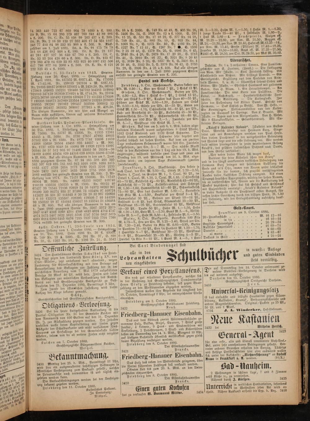 Geld⸗Cours. Frankfurt am 9. October 1880. 20⸗Frankenstücke 3 M. 16 12—16 do. VVV 10—14 Englische Sovereigns.„ 20 29—34 Russische Imperialess 16 69—74 Dueaten n n 9 60-65 al marco.„CCC Dollars in Gold 421—24