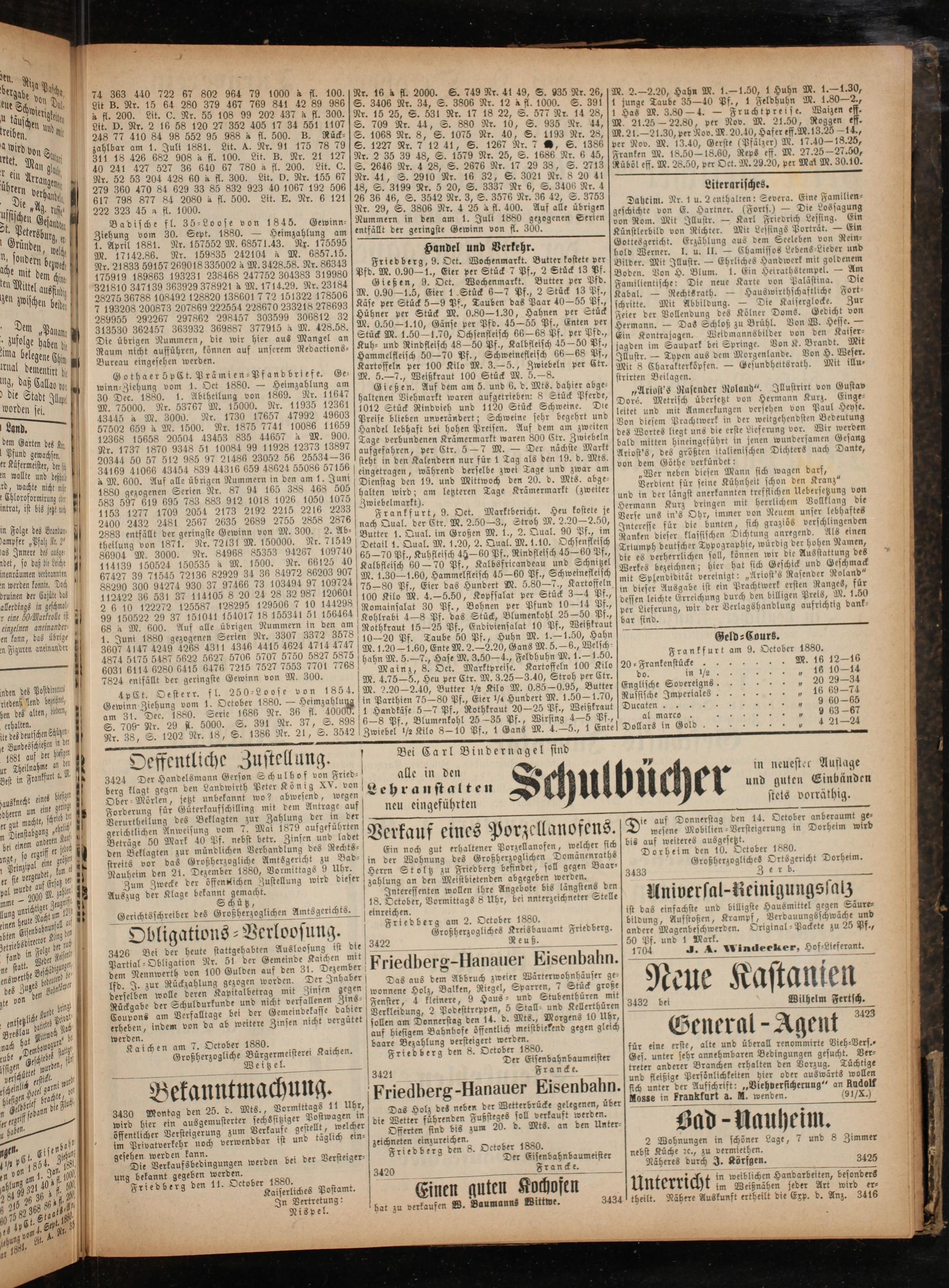 Handel und Verkehr. Friedberg, 9. Oet. Wochenmarkt. Butter kostete per Pfd. M. 0.90—1., Eier per Stück 7 Pf., 2 Stuͤck 13 Pf.