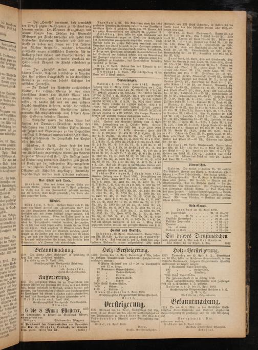 Badische fl. 35 Loose von 1845. Gewinn Ziehung vom 31. März 1880. Heimzahlung am 1. Oet. 1880. Nr. 62313 M. 68571.43. Nr. 284361 M. 17142.86. Nr. 194455 255513 à M. 6857.15. Nr. 116201 244916 267690 327547 à M. 3428,58. Nr. 17420 24123 25013 59958 89023 153886 183286 184811 227647 241589 318356 327692 à M. 1714.29. Nr. 9724 25017 36021 38166 75591 106816 44 112809 159594 162211 15 183251 93 186507 195332 206947 207493 208665 213585 255531 257792 267303 657 289105 307573 89 317626 364354 67 à M. 428.58. Die übrigen Nummern können auf unserem Bureau nachgesehen werden.