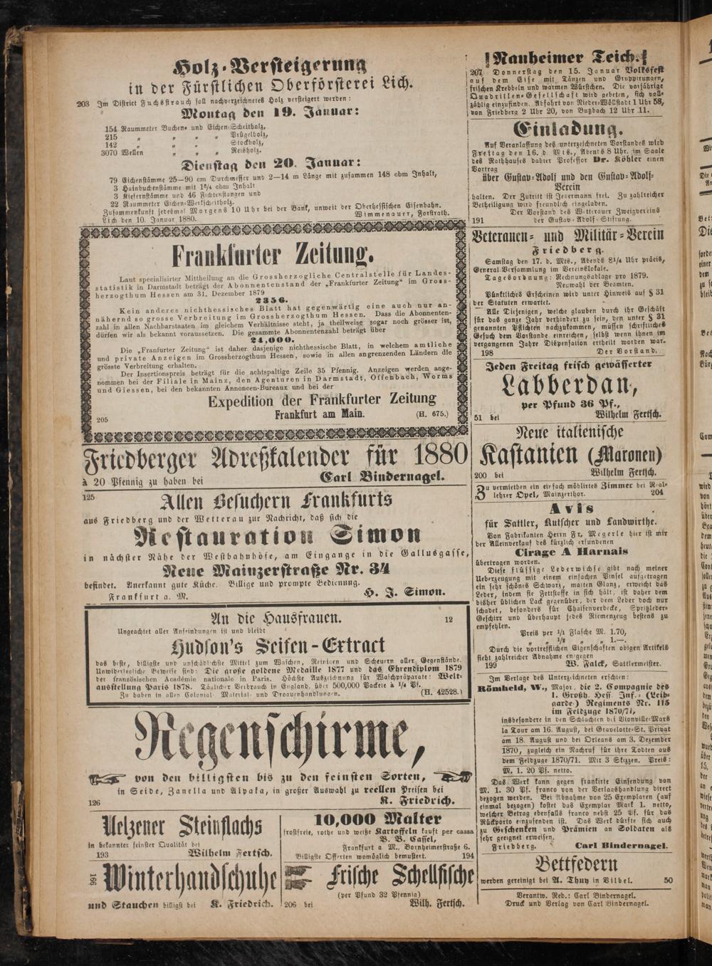 lese οοοο οοοοοοοον N ee Friedberger Adreßkalender für 1880 à 20 Pfennig zu haben bei Carl Bindernagel.