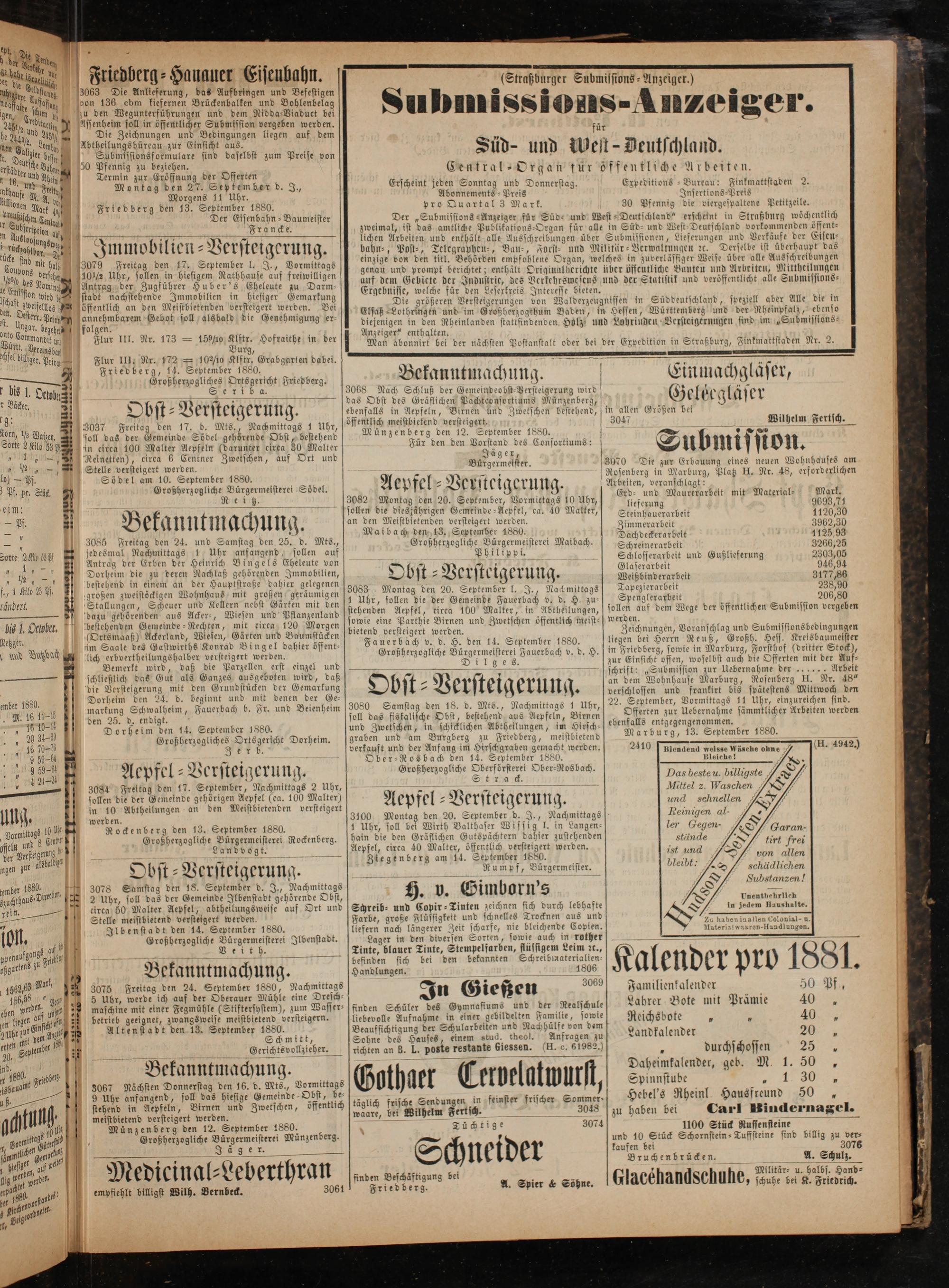 Bekanntmachung. 3075 Freitag den 24. September 1880, Nachmittags 5 Uhr, werde ich auf der Oberauer Mühle eine Dresch⸗ maschine mit einer Fegmühle(Stiftersystem), zum Wasser⸗ betrieb geeignet, zwangsweise meistbietend versteigern. Altenstadt den 13. September 1880. Schmitt, Gerichtsvollzieher. Bekanntmachung. 3067 Nächsten Donnerstag den 16. d. Mts., Vormittags 9 Uhr anfangend, soll das hiesige Gemeinde-Obst, be⸗ stehend in Aepfeln, Birnen und Zwetschen, öffentlich meistbietend versteigert werden. Münzenberg den 12. September 1880. Großherzogliche Bürgermeisterei Münzenberg. Ager.