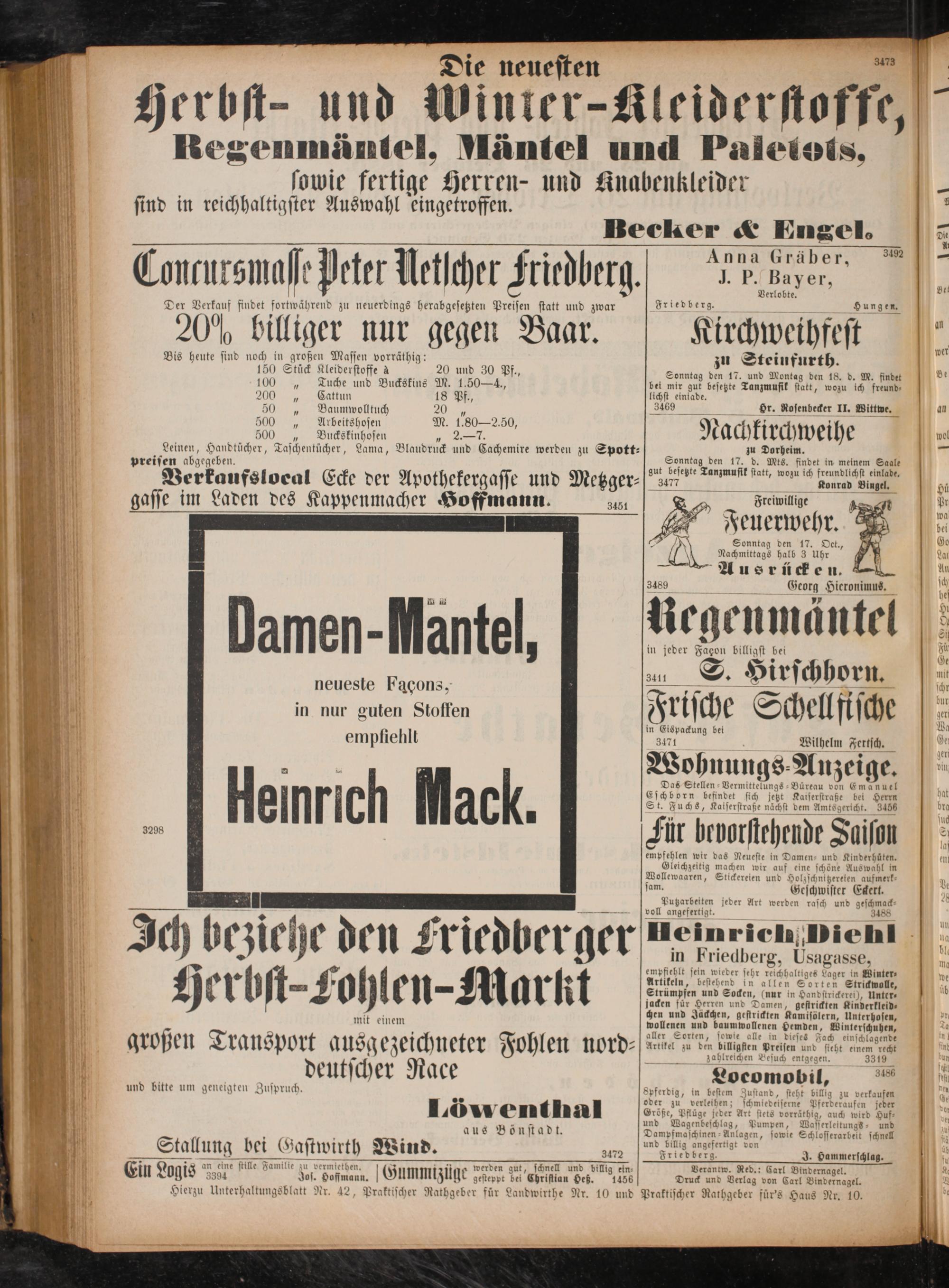 Bis heute sind noch in großen Massen vorräthig: 150 Stück Kleiderstoffe à 20 und 30 Pf., 100„ Tuche und Buckskins M. 1.50—4., 200„ Cattun 18 Pf., 50„ Baumwolltuch 2 500„ Arbeitshosen 500„ Buckskinhosen Leinen, Handtücher, Taschentücher, Lama, preisen abgegeben.