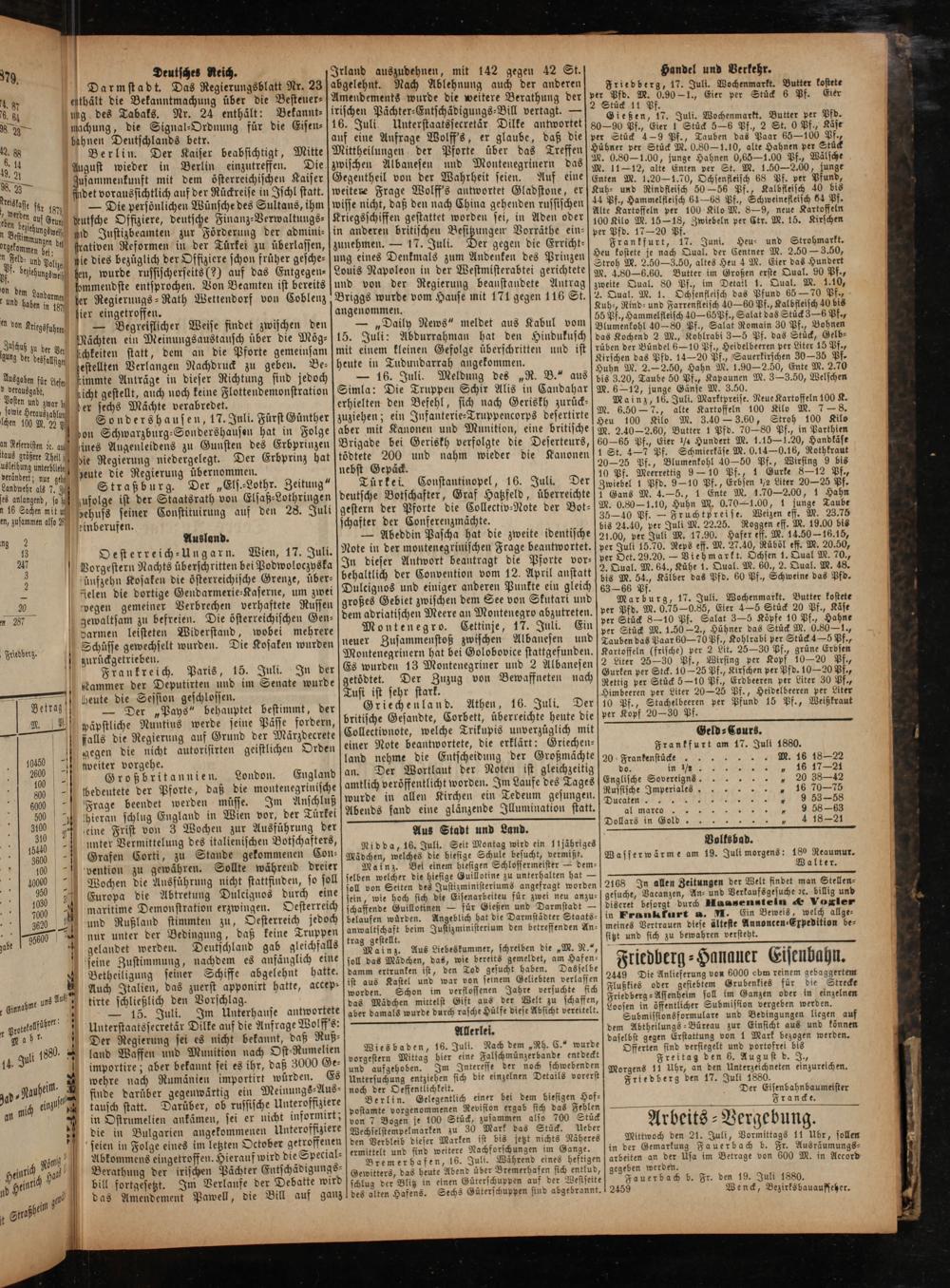 Frankfurt am 17. Juli 1880. 20 Frankenstücke.. M. 16 18—22 do. in ½/2„ 16 17—21 Englische Sovereigns.„ 20 38—42 Russische Imperiales.„ 16 70—75 Duca len„ 9 53—58 al marco.„ 9 58—63 Dollars in Gold. 3„ 4 18—21 Volksbad. Wasserwärme am 19. Juli morgens: 180 Reaumur. Walter.