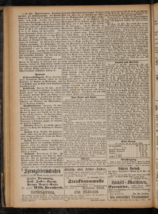— 18. Febr. Abgeordnetenhaus. Berathung des Feld und Forswolizeigesetzes. Die Vorlage kommt zur Berathung nach der Fassung des Herren; hauses, durch welche, abgesehen von mehreren redactionellen Aenderungen auch der§ 41(soge⸗ nannter Beeren und Pilz⸗Paragraph) eine materielle Modification erfahren hat. In der Specialdiscussion werden die 88 1—40 unverändert angenommen, § 41 in der Fassung des Herrenhauses. Die übrigen Paragraphen werden ohne Debatte unver- ändert angenommen und hierauf das ganze Gesetz mit großer Majorität genehmigt.— 19. Febr. Berathung des Antrages der Regierung auf Ver; tagung des Landtages Der Antrag wird nahezu einstimmig angenommen. Der Gesetzentwurf, betr. die Abänderung des Gesetzes über die Lösung des Lehns verbandes ꝛc. wird in dritter Lesung ohne Debatte genehmigt, desgleichen der Gesetzentwurf betreffend die Verwendung der Reichssteuerüberschüsse nach unerheblicher Discussion. Es folgt noch eine Reihe kleinerer unbedeutender Vorlagen.