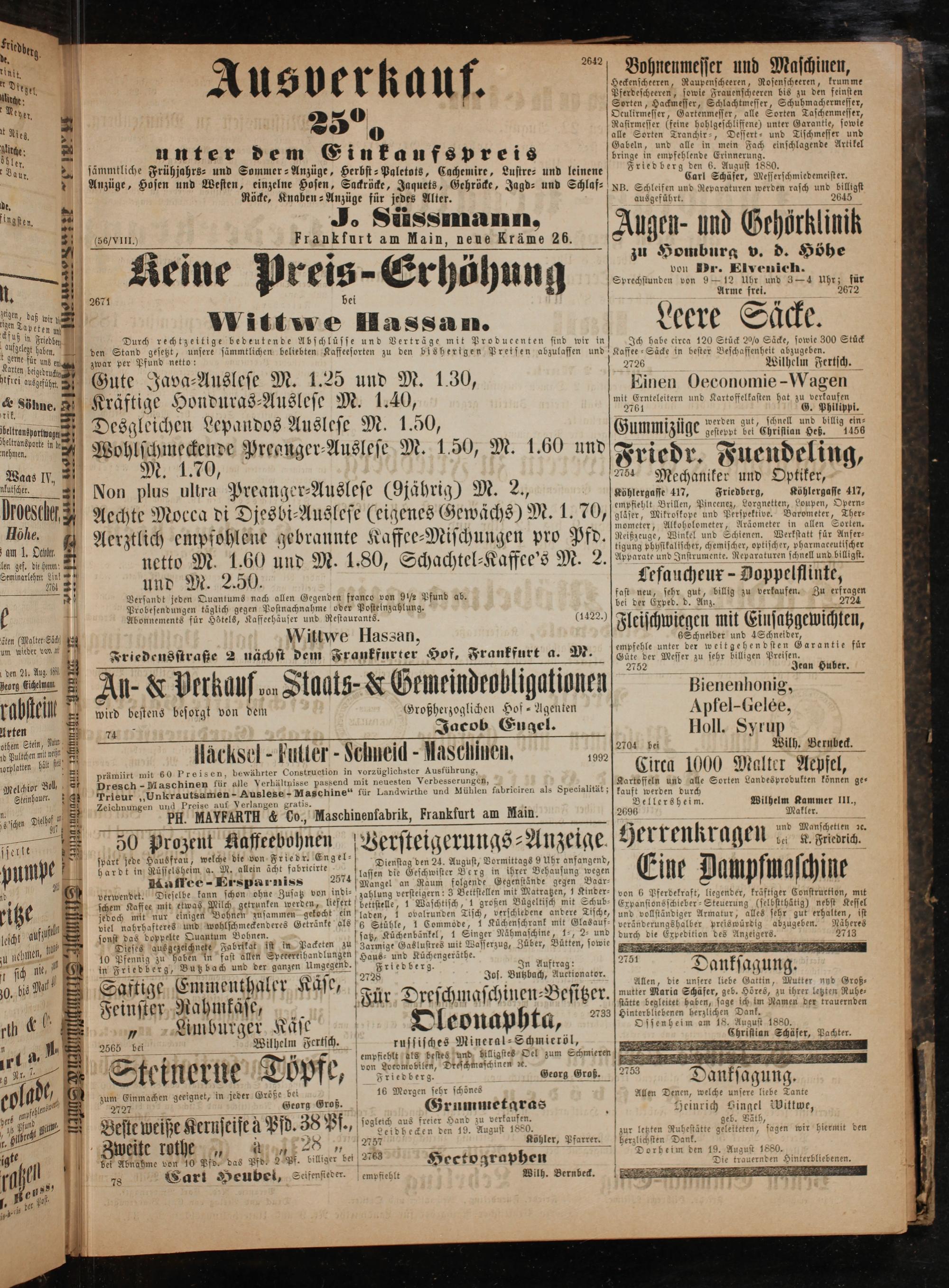 Bohnenmesser und Maschinen, Heckenscheeren, Raupenscheeren, Rosenscheeren, krumme Pferdescheeren, sowie Frauenscheeren bis zu den feinst en Sorten, Hackmesser, Schlachtmesser, Schuhmachermesser, Oculirmesser, Gartenmesser, alle Sorten Taschenmesser, Rasirmesser(feine hohlgeschliffene); unter Garantie, sowie alle Sorten Tranchir-, Dessert- und Tischmesser und Gabeln, und alle in mein Fach einschlagende Artikel bringe in empfehlende Erinnerung. Fried berg den 6. August 1880. Carl Schäfer, Messerschmiedemeister. illigst 2645