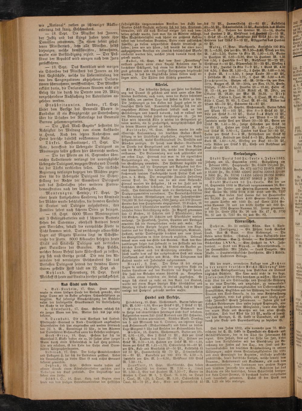 Gießen, 14. Sept. Der heutige Viehmarkt war in Folge des israelitischen Feiertages nicht stark befahren. Aufgetrieben waren 540 Stück Rindvieh und 255 Schweine. Die Preise blieben unverändert. Nächster Markt Dienstag den 5. und Mittwoch den 6. October, am letzteren Tage auch Krämermarkt(Michaelismarkt) und findet an diesem Tage Morgens 8 Uhr das Verlesen der Krämerstände statt.