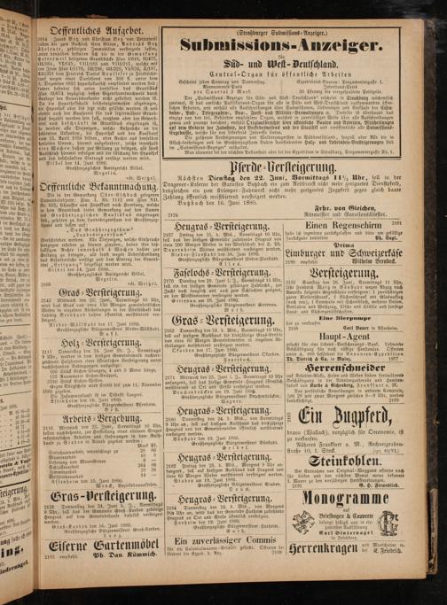 Heugras-Versteigerung. 2171 Mittwoch den 23. Juni l. J., Vormittags 10 Uhr anfangend, soll das hiesige Gemeinde ⸗Heugras öffentlich meistbietend an Ort und Stelle versteigert werden. Bruchenbrücken am 19. Juni 1880. Großherzogliche Bürgermeisterei Bruchenbrücken. Wagner.