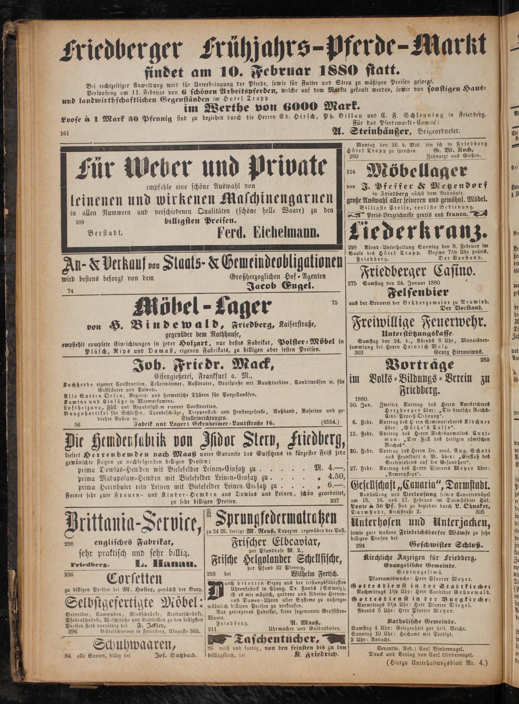Loose à 1 Mark 30 Pfennig sind zu beziehen durck die Herren Ed. Hirsch, Ph. Billau und C. F. Schleuning in Friedberg. Für das Pferdemarkt Comité: 161 A. Steinhäußer, Beigeordneter.