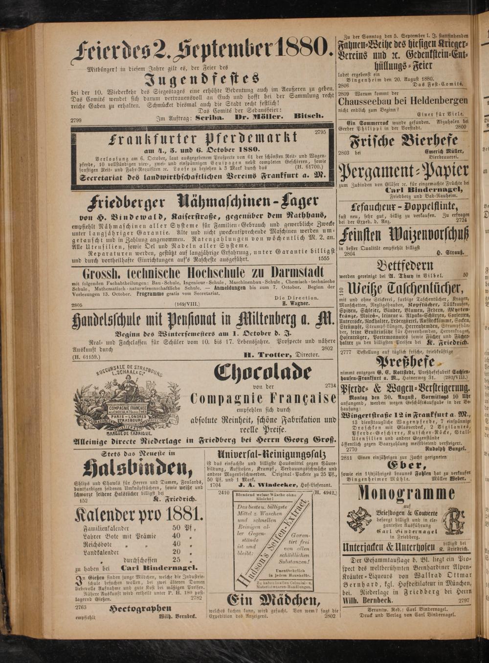 Verantw. Red.: Carl Bindernagel. Druck und Verlag von Carl Bindernagel.