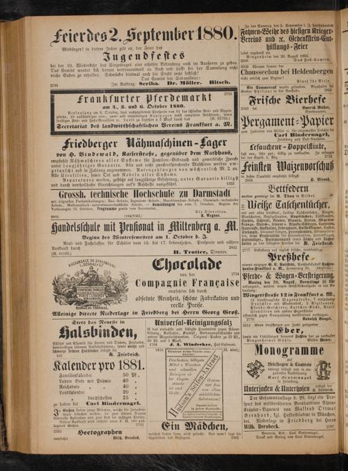 buntfarbigen seidenen Umknöpftüchern, sowie weiße und 1704 J. A. Windeeker, Hof⸗Lieferant. schwarze seidene Halstücher billigfe be— 2 2 2440 Blendend welsse n 3 ohne„ 4942.) 152 K. Friedrich. Uleiche!. V 1 1 5* 1 Das beste u. hilligete 8 alender 1b 1 Mittel z. Paschen 20 nd schnellen Familienkalender 50 Pf, Reinigen al- Labrer Bote mit Prämie 40„ ler 1 Garan-— 481 stiinde 55 Reichsbote 0 6 Ne tirt frei 7 0 25 0 Ie Landkalender ie Beibz 5 8 sdb 9 755 25* Schliil lichen 3 durchschossen 3 D zu haben bei Carl Bindernagel. e nenthehrlien n Gießen finden junge Mädchen, welche die Industrie= in jedem Haushalte. schule besuchen wollen, bei zwei älteren Damen 3. liebevolle Aufnahme und gute Kost bei mäßigen Preisen. Material waaren-Handlungen. Nähere Auskunft wird ertheilt unter P. H. 180 post lagernd Gießen. 2782 Ein Mädch en 9 Hectographen f hen, 2 a welches kochen kann, wird gesucht. Von wem? sagt die empfiehlt Wilh. Bernbeck. Expedition des Anzeigers. 2802