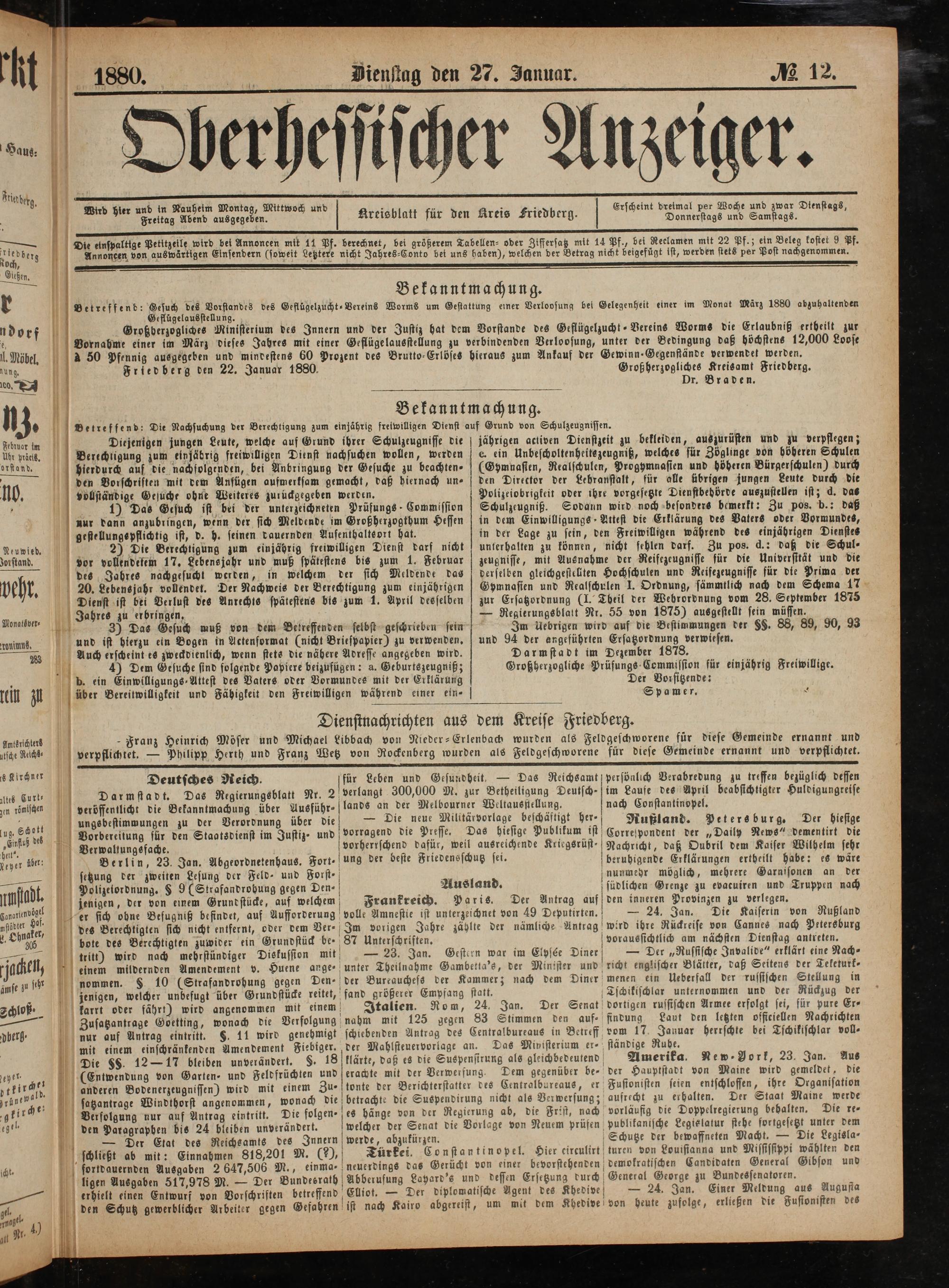 Dienstnachrichten aus dem Kreise Friedberg. Franz Heinrich Möser und Michael Libbach von Nieder-Erlenbach wurden als Feldgeschworene für diese Gemeinde ernannt und verpflichtet.— Philipp Herth und Franz Wetz von Rockenberg wurden als Feldgeschworene für diese Gemeinde ernannt und verpflichtet.