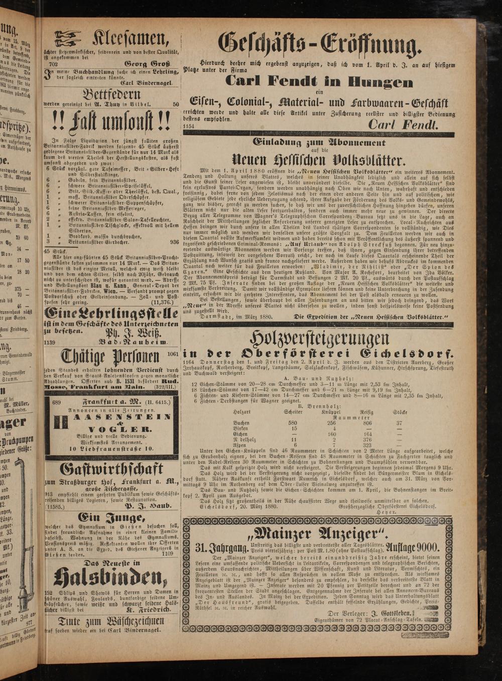Mit dem 1. April 1880 eröffnen die„Neuen Hessischen Volksblätter“ ein weiteres Abonnement Tendenz und Haltung unseres Blattes, welches in seiner Unabhängkeit lediglich und allein auf sich selbst