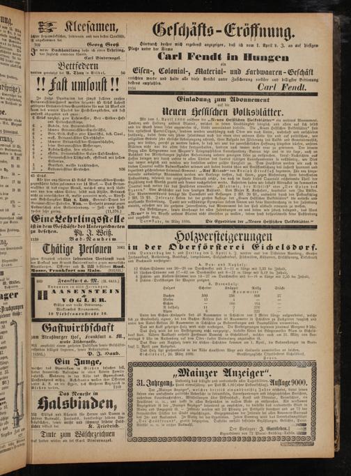 „Mainzer Anzeiger“. 31. Jahrgang. Unstreitig das billigste und verbreitetste aller Tagesblätter. Auflage 9000.