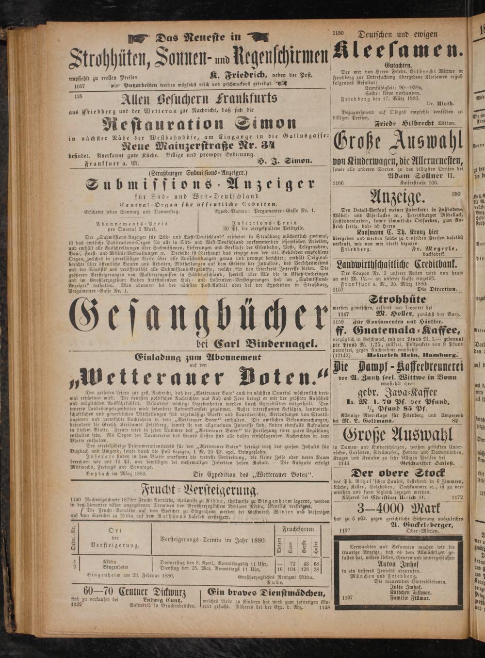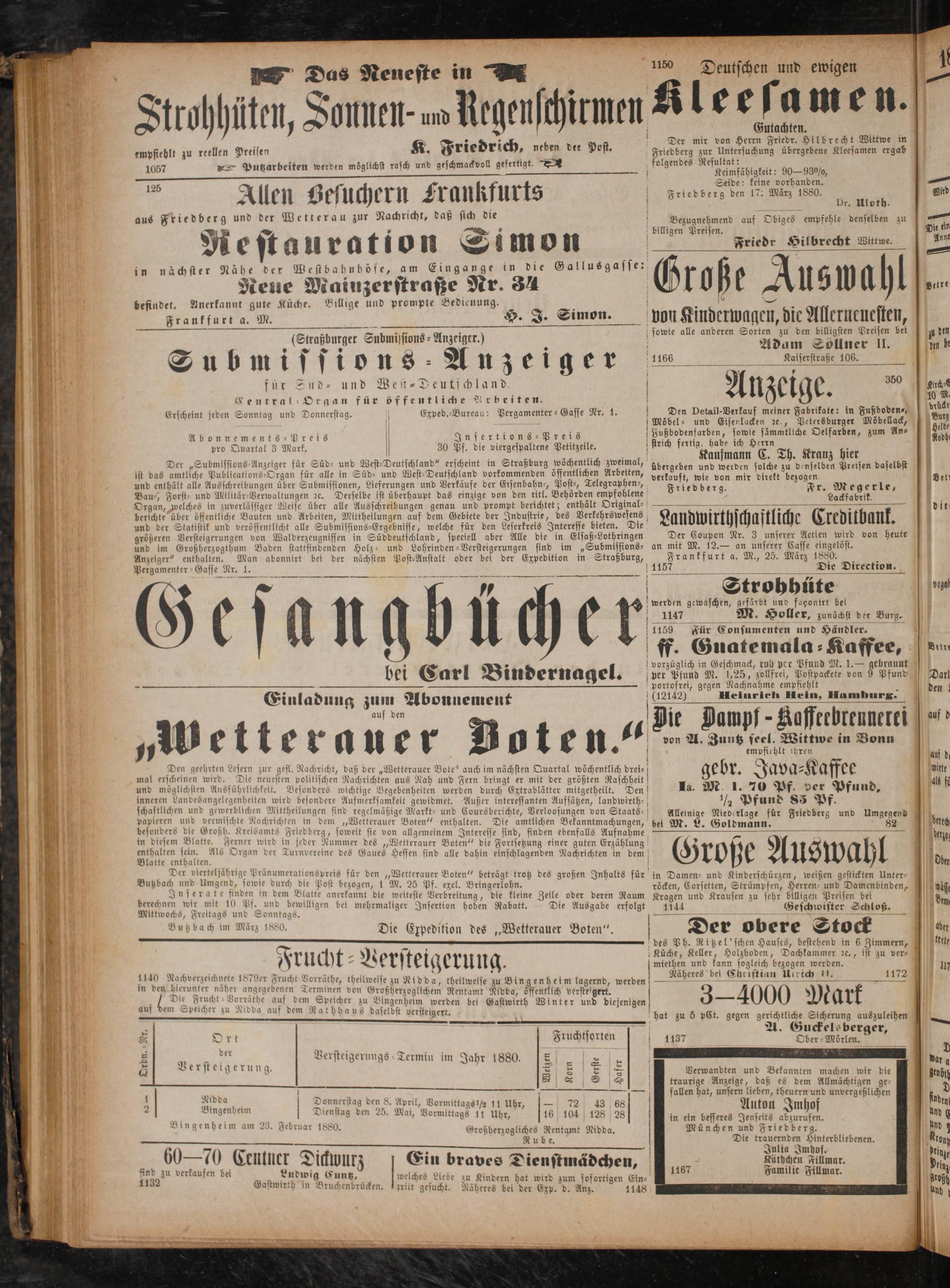 — Tr far 88 Ort Fruchtsorten r Ober-Mörlen. 2 3 der Versteigerungs Termin im Jahr 1880. D 8 Versteigerung 7 8 5 ir di 8 stelgerung. 8 2 8 Verwandten und Bekannten machen wir die . S 8 traurige Anzeige, daß es dem Allmächtigen ge⸗ rs 5 g 8 1 23 fallen hat, unsern lieben, theuern und unvergeßlichen 2 0 Donnerstag den 8. April, Vormittag 0 3 9 ag 2 8 7 4 Bingenheim[Dionnerstag den S. April, Vormittags) 11 Uhr, 72 43 680 Auton Imhof 0 Dienstag den 25. Mai, Vormittags 11 Uhr 16 104 128 28 ö 1 3 del Bin genheim am 23. Februar I ö 5 a. V.. besseres Arens* 2 0 eim am 23. Februar 1880. Großherzogliches Rentamt Nidda. München und Friedberg. Nu be. Die trauernden Hinterbliebenen. *——* li J f A 3 2—— In 10 Imgof. 6070 Ceutner Dickwurz J Ein braves Dienstmädchen, Fauihe mar. find zu verkaufen bei aindwig C elches a 5 Familie Fi Bar erkaufen bei N Ludwig Cuntz, welches Liede zu Kindern hat wird zum sofortigen Ein⸗ ee. 2 Gastwirth in Bruchenbrücken. Izritt gesucht. Näheres bei der Exp. d. Anz. 1148