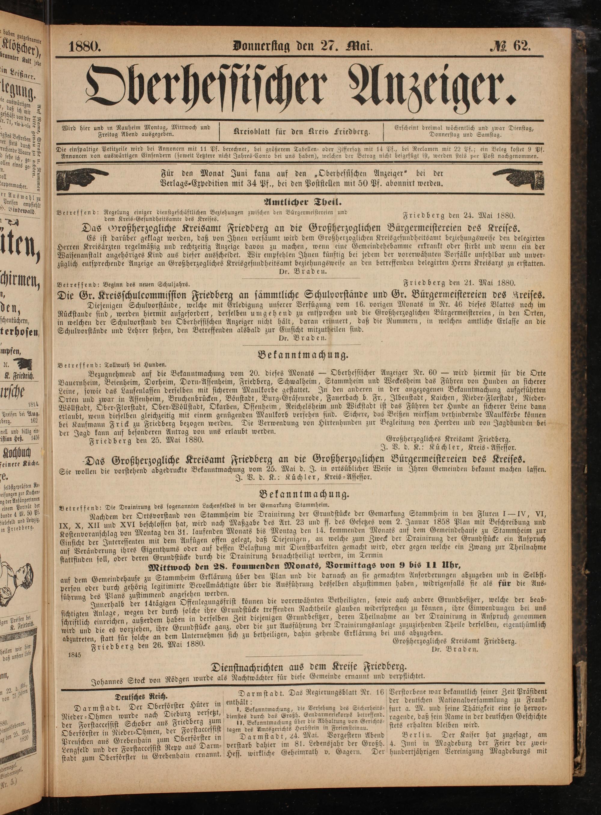 Friedberg den 25. Mai 1880. Großherzogliches Kreisamt Friedberg. J. V. d. K.: Küchler, Kreis ⸗-Assessor.