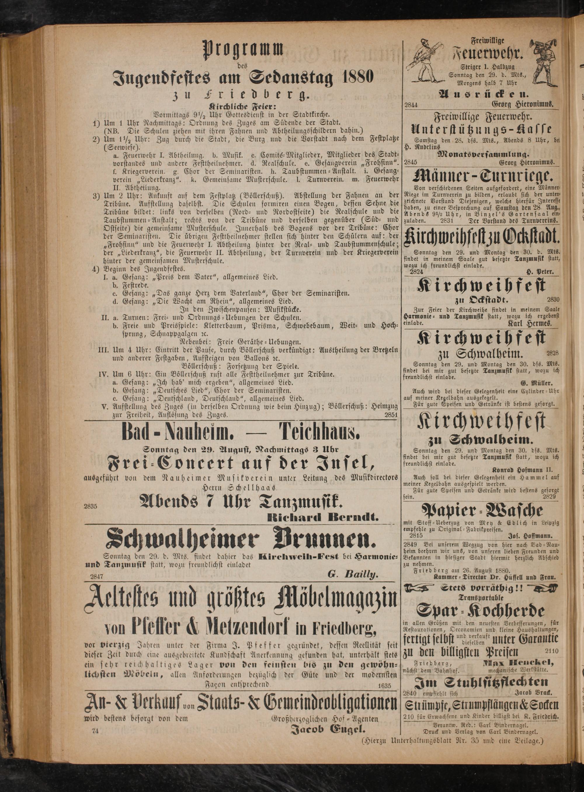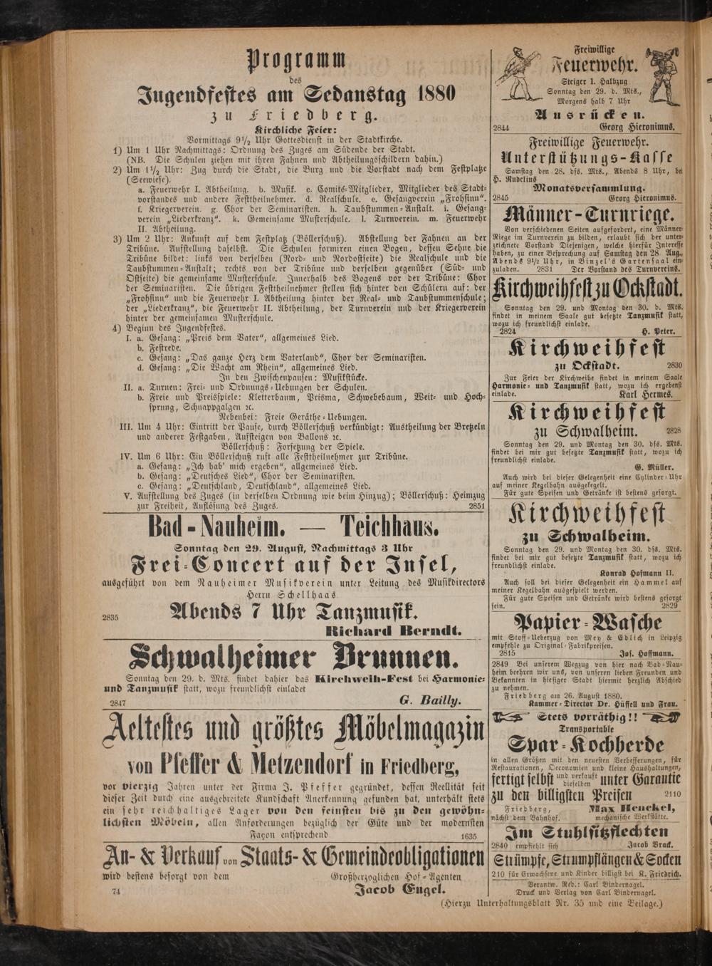 — 2 zu Schwalheim. Sonntag den 29. und Montag den 30. dss. Mts. findet bei mir gut besetzte Tanzmufik statt, wozu ich freundlichst einlade.