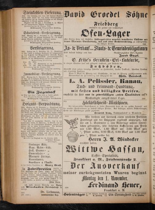 3662 Freitag den 5. November lfd. J., Vormittags 11 Uhr, sollen in hiesigem Rathhause die nachgenannten zu dem Nachlasse des Metzgermeisters Friedrich August Waas gehörenden Grundstücke erbvertheilungshalber öffentlich an den Meistbietenden versteigert werden. Gemarkung Friedberg.