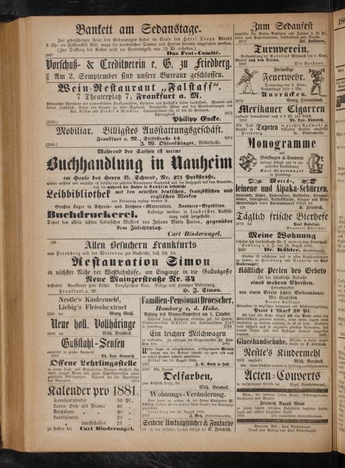 Zur zehnjährigen Feier des Sedanstages findet im Saale des Hötel Trapp Abends 8 Uhr ein Festbankett statt, wozu die verehrlichen Damen und Herren hiermit eingeladen werden.