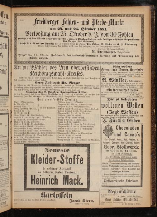 Wegen Unterbringung der Fohlen wolle man sich rechtzeitig an den Unterzeichneten wenden. Für das Pferdemarkt-Comité: A. Steinhäußer, Beigeordneter.