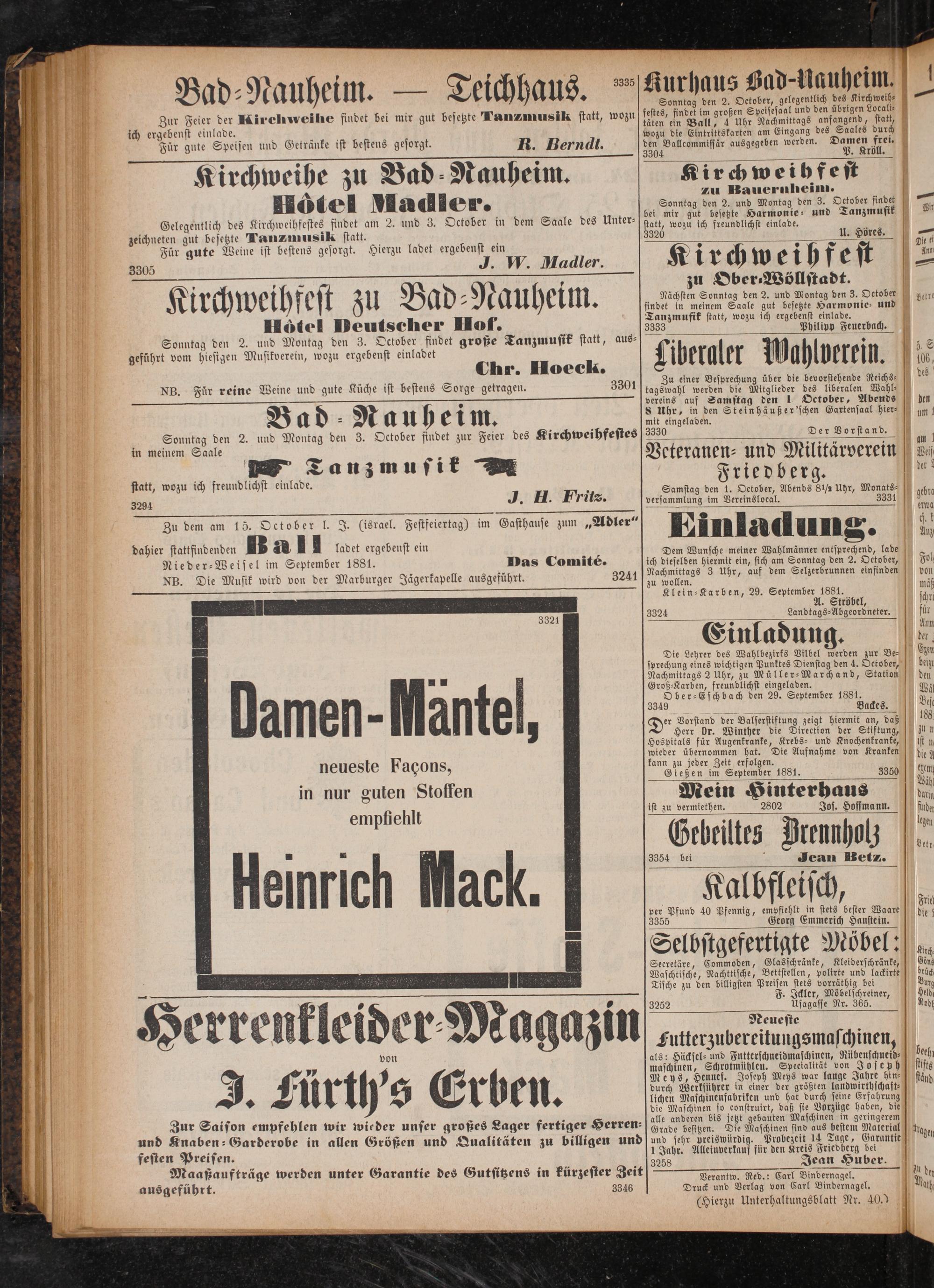 Gießen im September 1881. 3350 Mein Hinterhaus ist zu vermiethen. 2802 Jos. Hoffmann.
