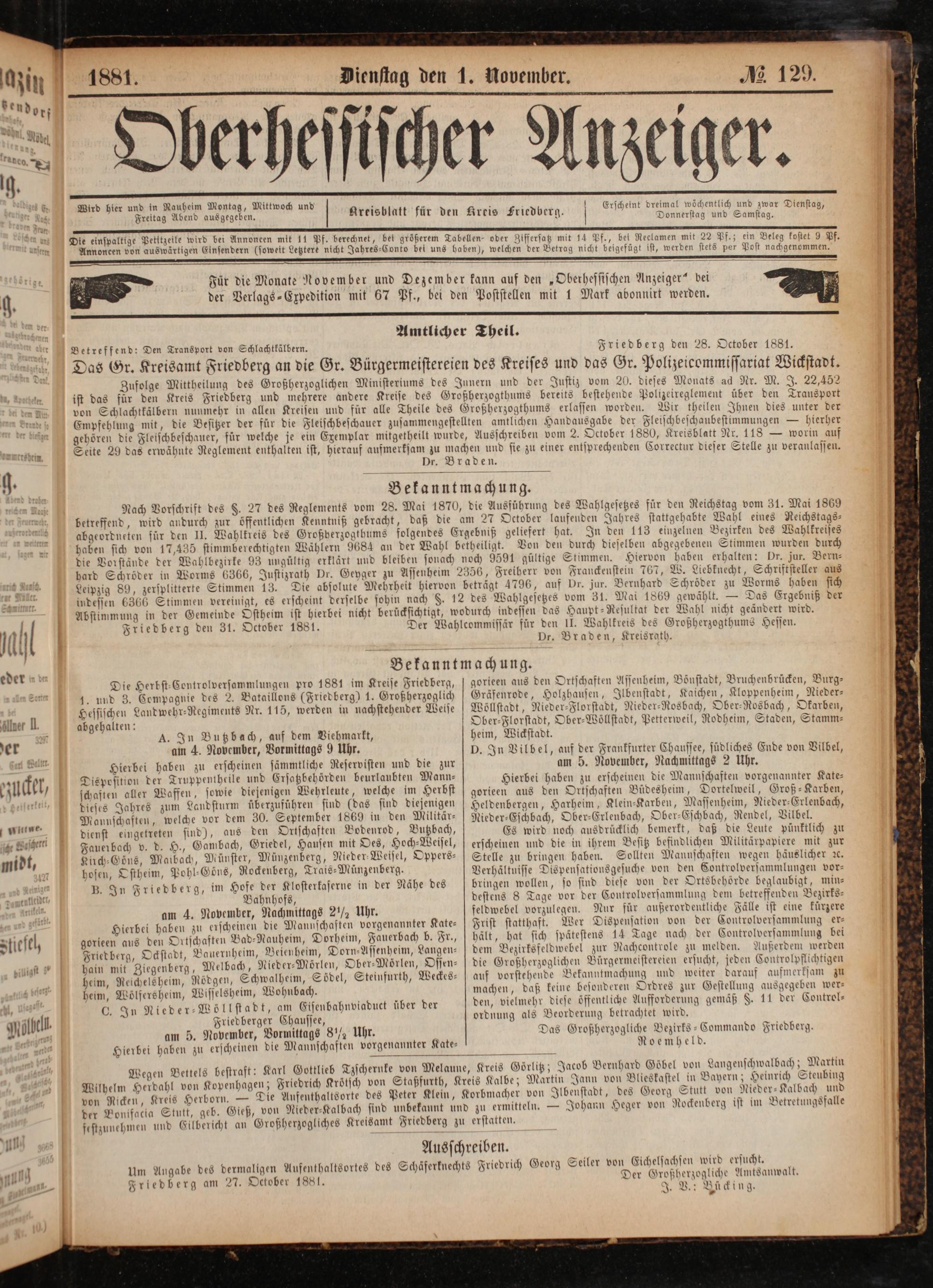 Für die Monate November und Dezember kann auf den„Obethessischen Anzeiger“ bei der Verlags-Expedition mit 67 Pf., bei den Poststellen mit 1 Mark abonnirt werden.