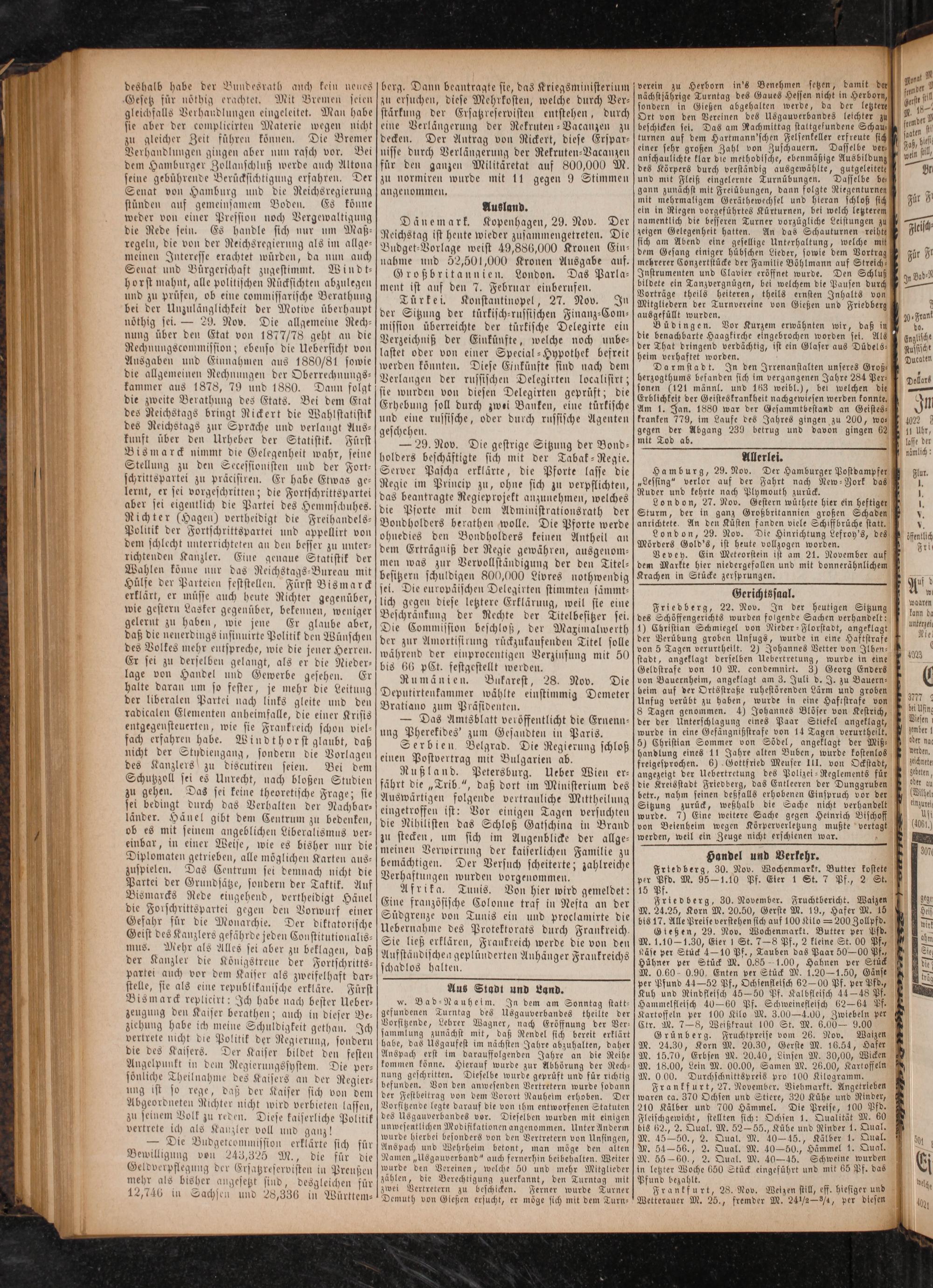 Friedberg, 22. Nov. In der heutigen Sitzung des Schöffengerichts wurden folgende Sachen verhandelt: 1) Christian Schmiegel von Nieder-Florstadt, angeklagt der Verübung groben Unfugs, wurde in eine Haftstrafe von 5 Tagen verurtheilt. 2) Johannes Vetter von Ilben—