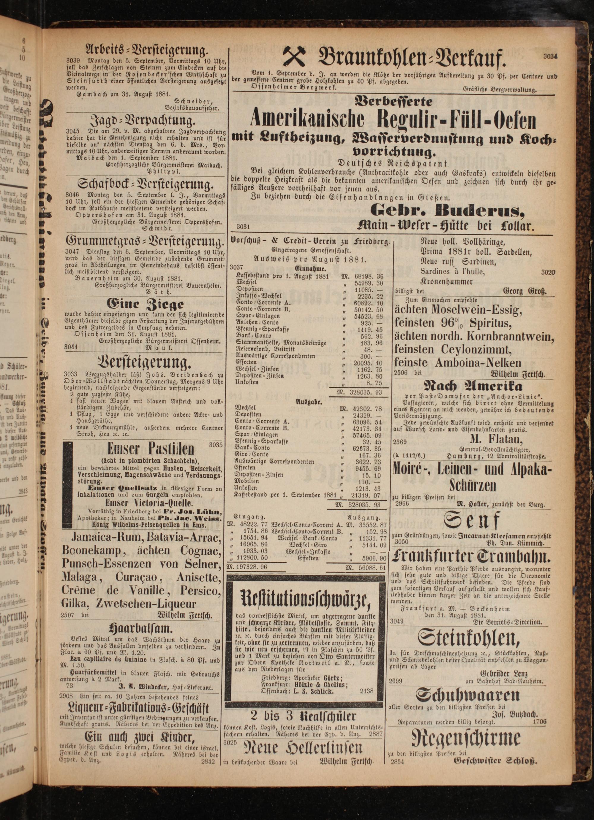 Vorschuß-& Credit- Verein zu Friedberg. Eingetragene Genossenschaft. Ausweis pro August 1881.