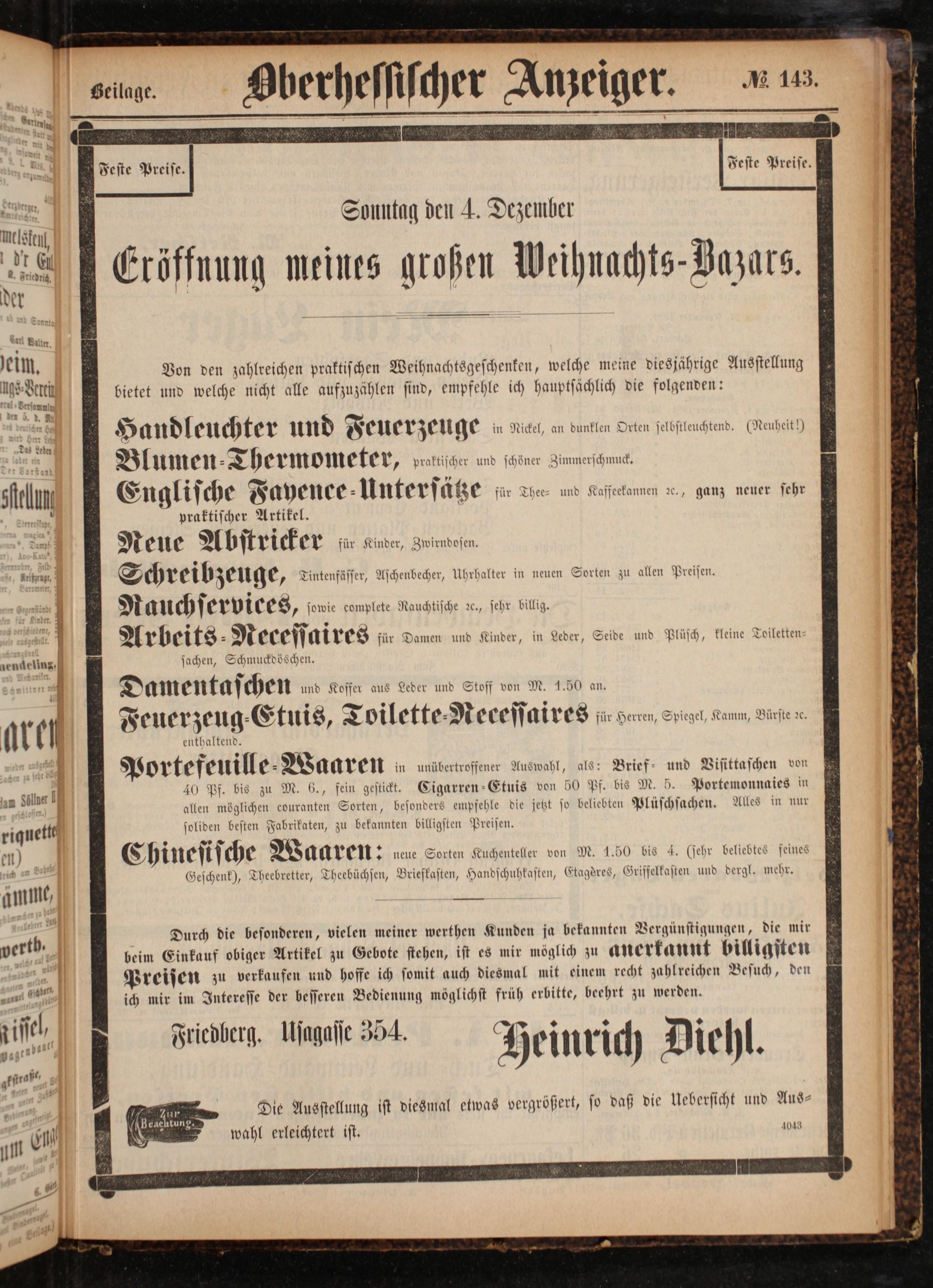 en) 1 Chinesische Waaren: neue Sorten Kuchenteller von M. 1.50 bis 4.(sehr beliebtes feines imme, Geschenk), Theebretter, Theebüchsen, Briefkasten, Handschuhkasten, Etagdres, Griffelkasten und dergl. mehr. amm—— erth. Durch die besonderen, vielen meiner werthen Kunden ja bekannten Vergünstigungen, die mir 5 e beim Einkauf obiger Artikel zu Gebote stehen, ist es mir möglich zu anerkannt billigsten N 60 1 Preisen zu verkaufen und hoffe ich somit auch diesmal mit einem recht zahlreichen Besuch, den echte, I N 8 2 f 1 1 f auen K ich mir im Interesse der besseren Bedienung möglichst früh erbitte, beehrt zu werden. „ el, 3 g 25 N N 2 e N Friedberg. Usagasse 354. Heinrich Diehl aii 1 s* akfraße,. 4. f