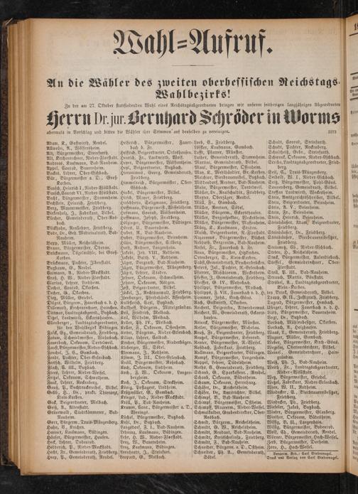 für den Wahlbezirk Büdingen. Keller, 85 Oekonom, Ossenheim, Falck, Gg., Gemeinderath, Friedberg. Ketter, Bürgerm., Nieder-Erlenbach. Reuß, Fr., Beigeordneter, Friedberg. Fatum, Schmiedmeister, Wohnbach. Kilian, Lehrer, Calbach. Kircher, Bürgermeister, Rinderbügen. Reuter, Bürgermeister, N. Weisel. Faust, Bürgermeister, Nieder-Eschbach. Kleberger, W., Södel.