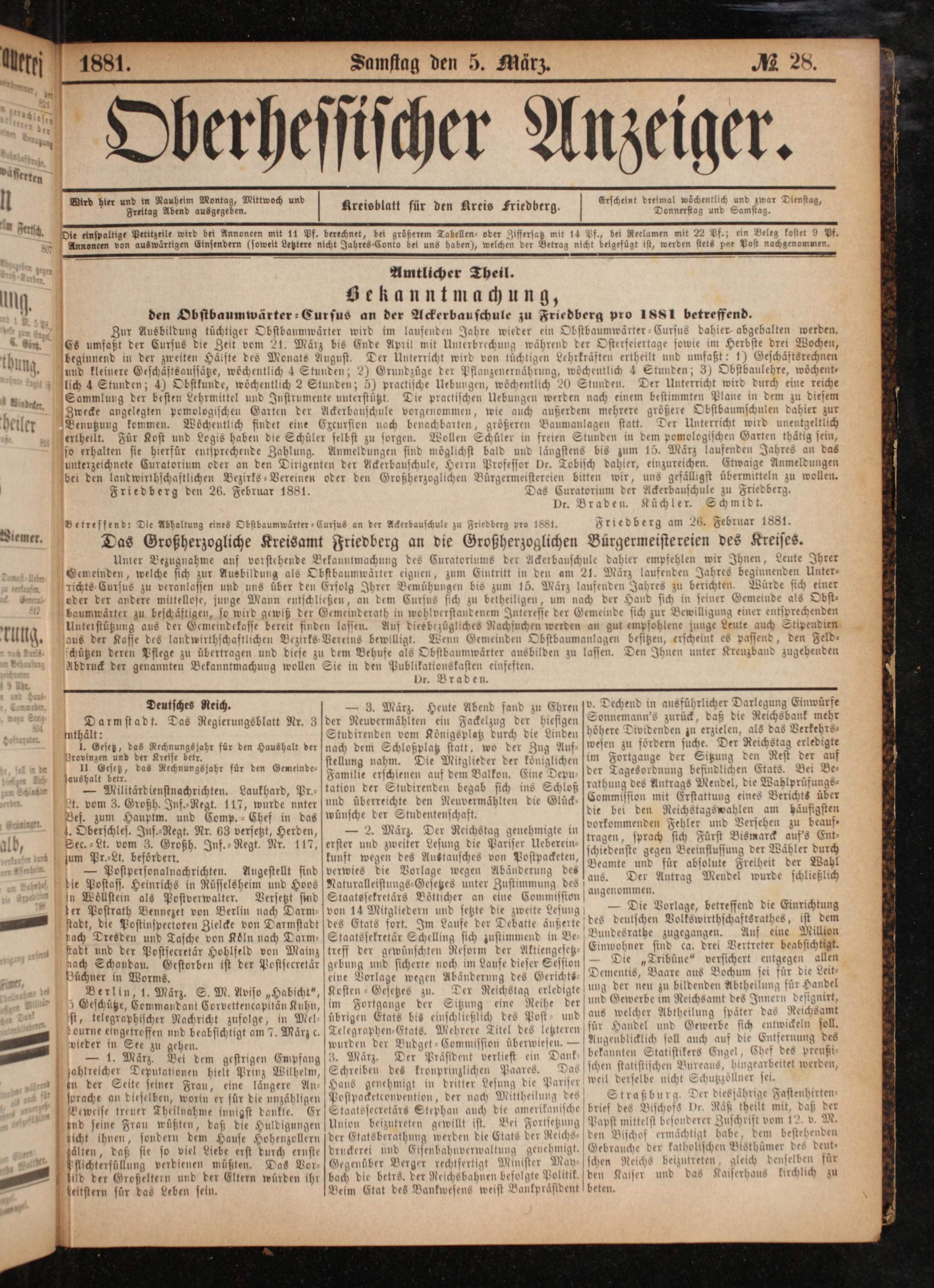 Friedberg den 26. Februar 1881. Das Curatorium der Ackerbauschule zu Friedberg. Dr. Braden. Küchler. Schmidt. Betreffend: Die Abhaltung eines Obstbaumwärter⸗Cursus an der Ackerbauschule zu Friedberg pro 1881. Friedberg am 26. Februar 1881.