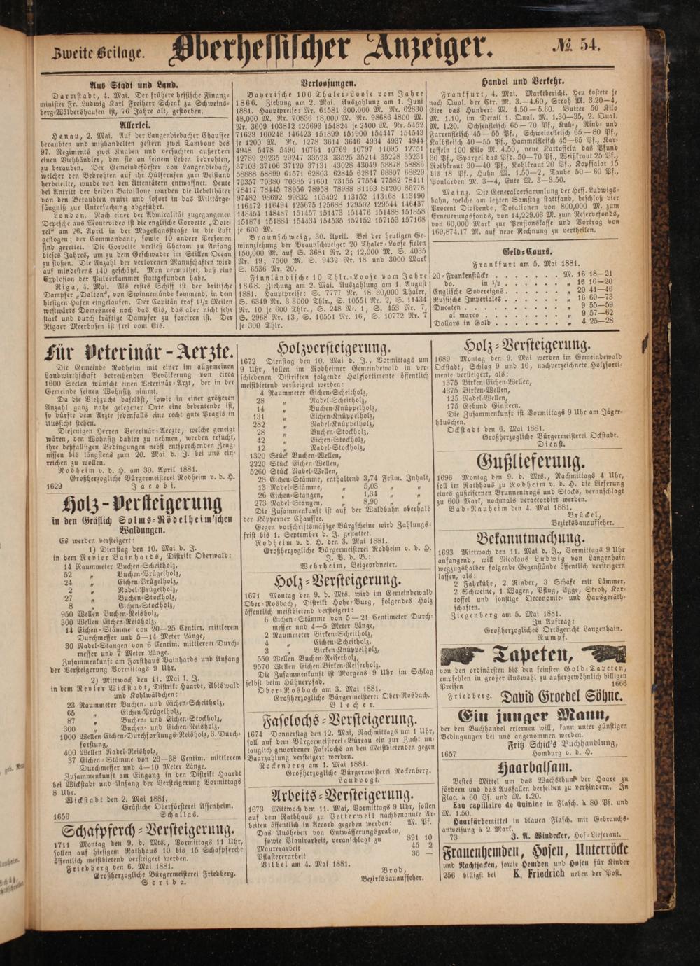 sollen auf hiesigem Rathhaus 10 bis 16 Schafpferch öffentlich meistbletend versteigert werden. Friedberg den 6. Mai 1881. Großherzogliche Bürgermeisterel Friedberg. Seriba.