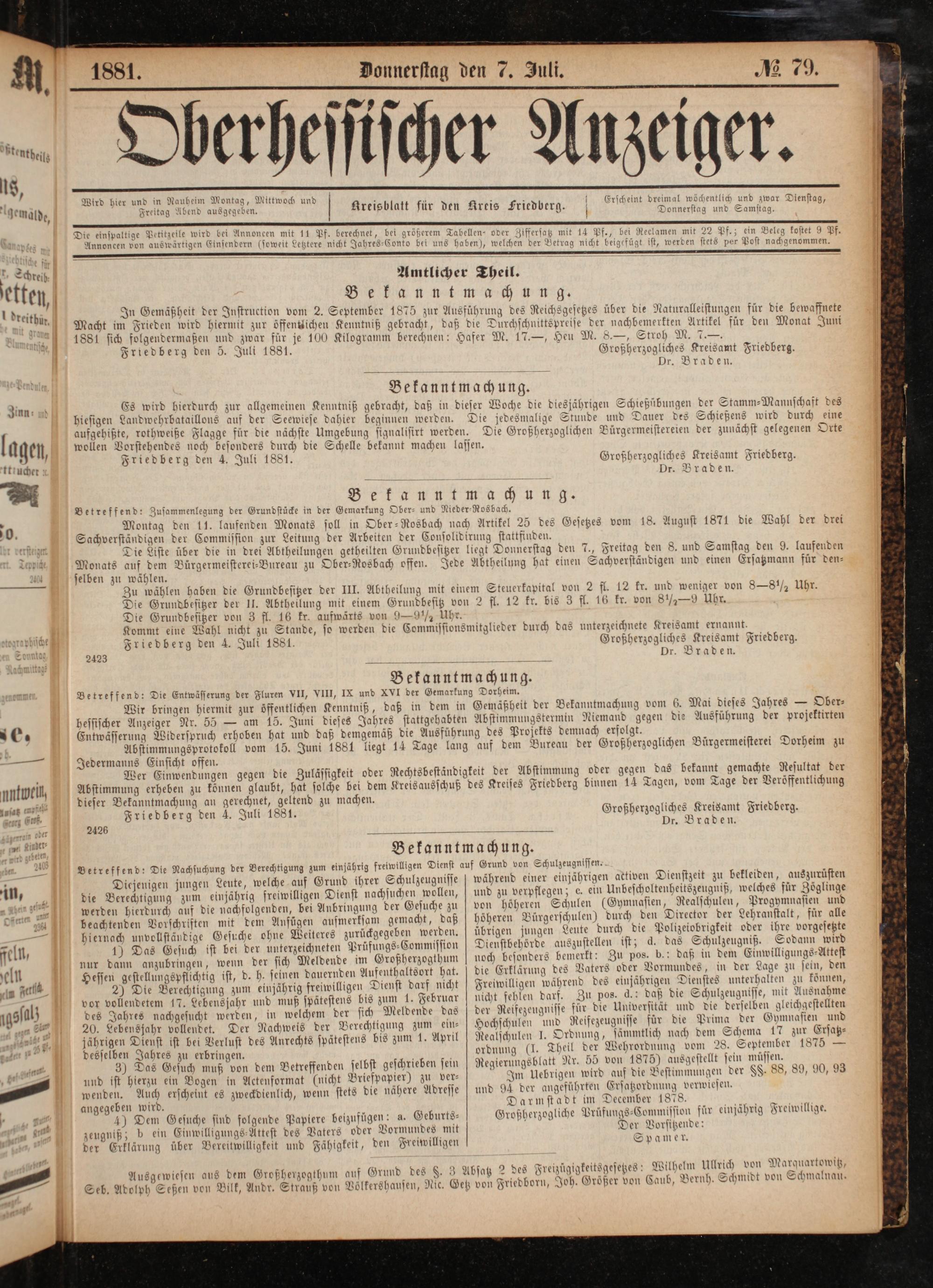 Großherzogliches Kreisamt Friedberg. Dr. Braden.