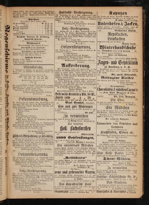 Montag den 10. Januar d. J., Vormittags 11 Uhr, soll in hiesigem Rathhaus die der Stadt Friedberg zu stehende Fischerei in der Usa, innerhalb der Gemarkung Friedberg, und im langen Weiher auf 12 Jahre öͤffent— lich meistbletend verpachtet werden.