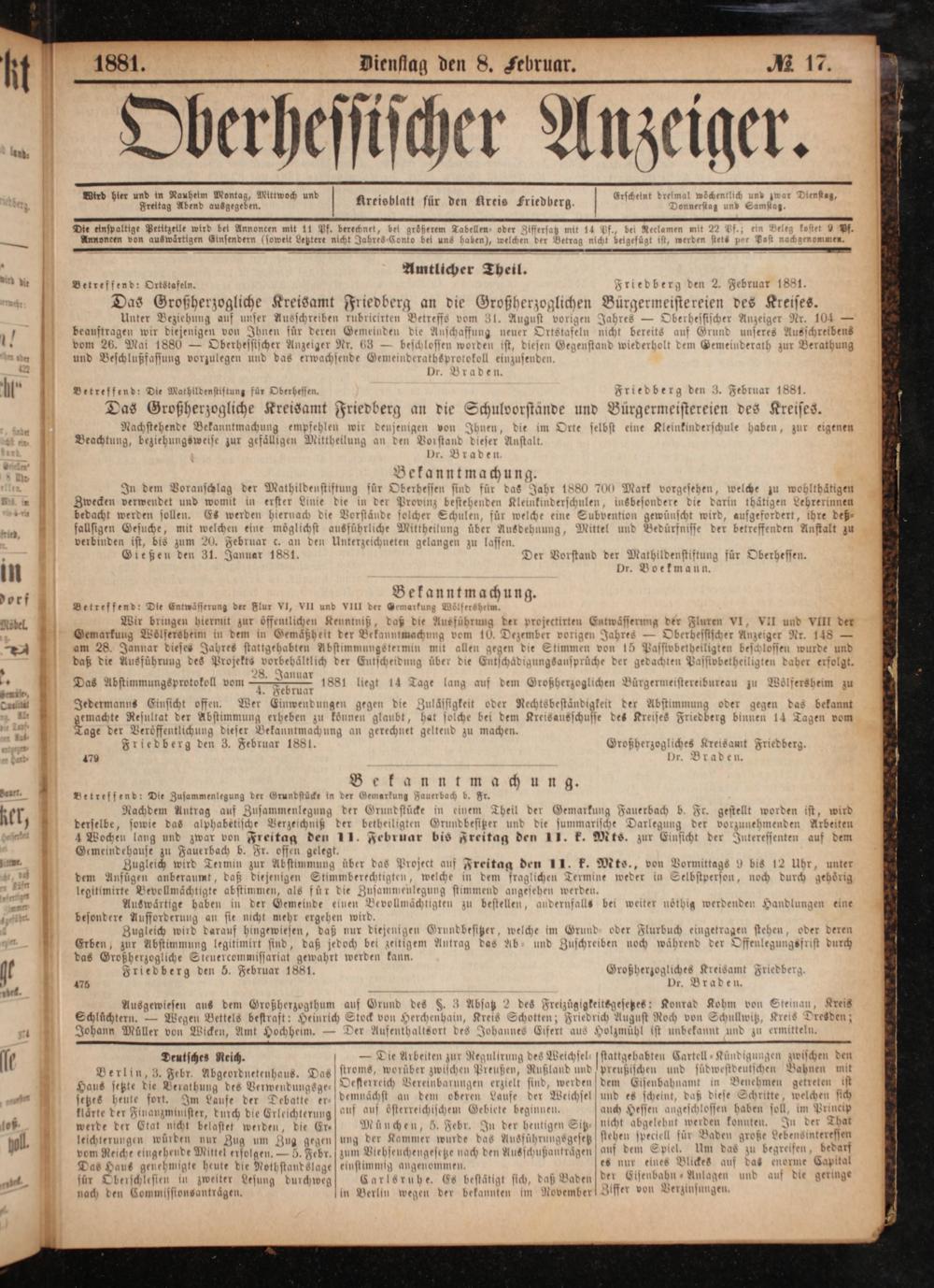 Friedberg den 5. Februar 1881. Großherzogliches Kreisamt Friedberg 475 Dr. Braden.