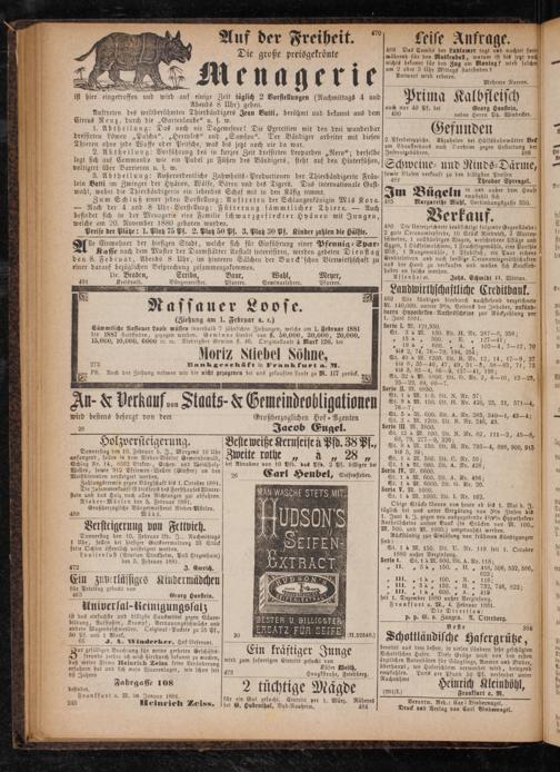 — Nach der 4 und 8 Uhr-Vorstellung: Fütterung sämmtlicher Thiere.— Auch befindet sich in der Menagerie eine Familie schwarzgefleckter Hyänen mit Jungen, welche am 20. November 1880 geboren wurden.