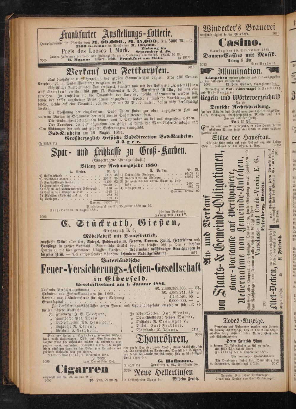 Mitgliederzahl am 31. Dezember 1880 S 56. Groß⸗Karben im August 1881. Für den Vorstand: 3085 Georg Müller IV. 75 9 2 1 * C. Stückrath, Gießen, Kirchenplatz B. 6, Möbelfabrik mit Dampfbetrieb, empfiehlt Möbel aller Art, Spiegel, Polsterarbeiten, Federn, Daunen, Zwilch, Federleinen und Vorhänge in großer Auswahl. Sämmtliche Artikel von den feinsten bis zu den einfachsten Sorten zu nie hier gewohnten billigsten Preisen.— Uebernahme vollständiger Einrichtungen in kürzester Frist.— Bei entsprechender Abnahme besondere Rabattgewährung. 1567 Vaterländische