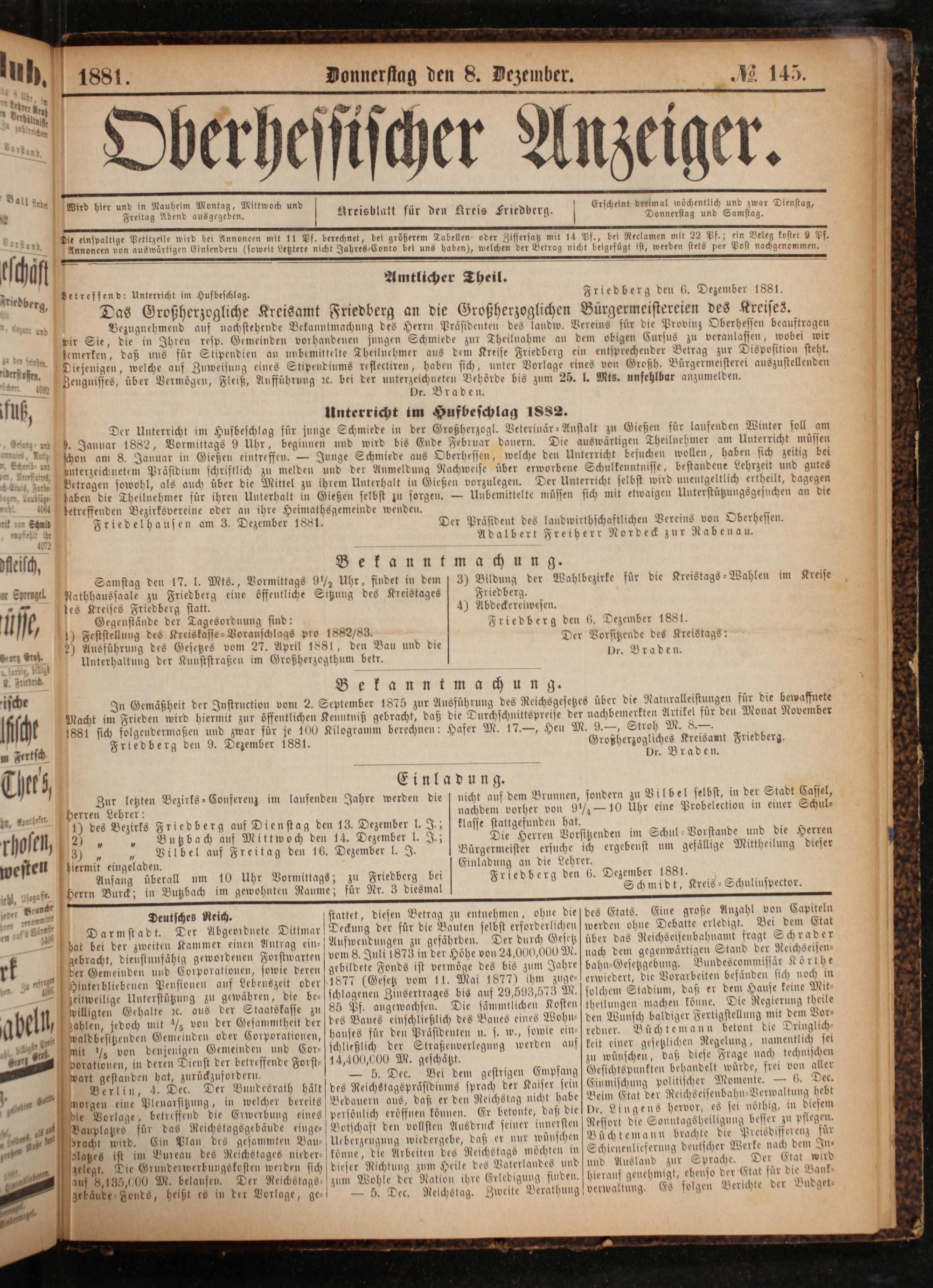 3) Bildung der Wahlbezirke für die Kreistags-Wahlen im Kreise Friedberg. 4) Abdeckereiwesen. Friedberg den 6. Dezember 1881. Der Vorsitzende des Kreistags: Dr. Braden.