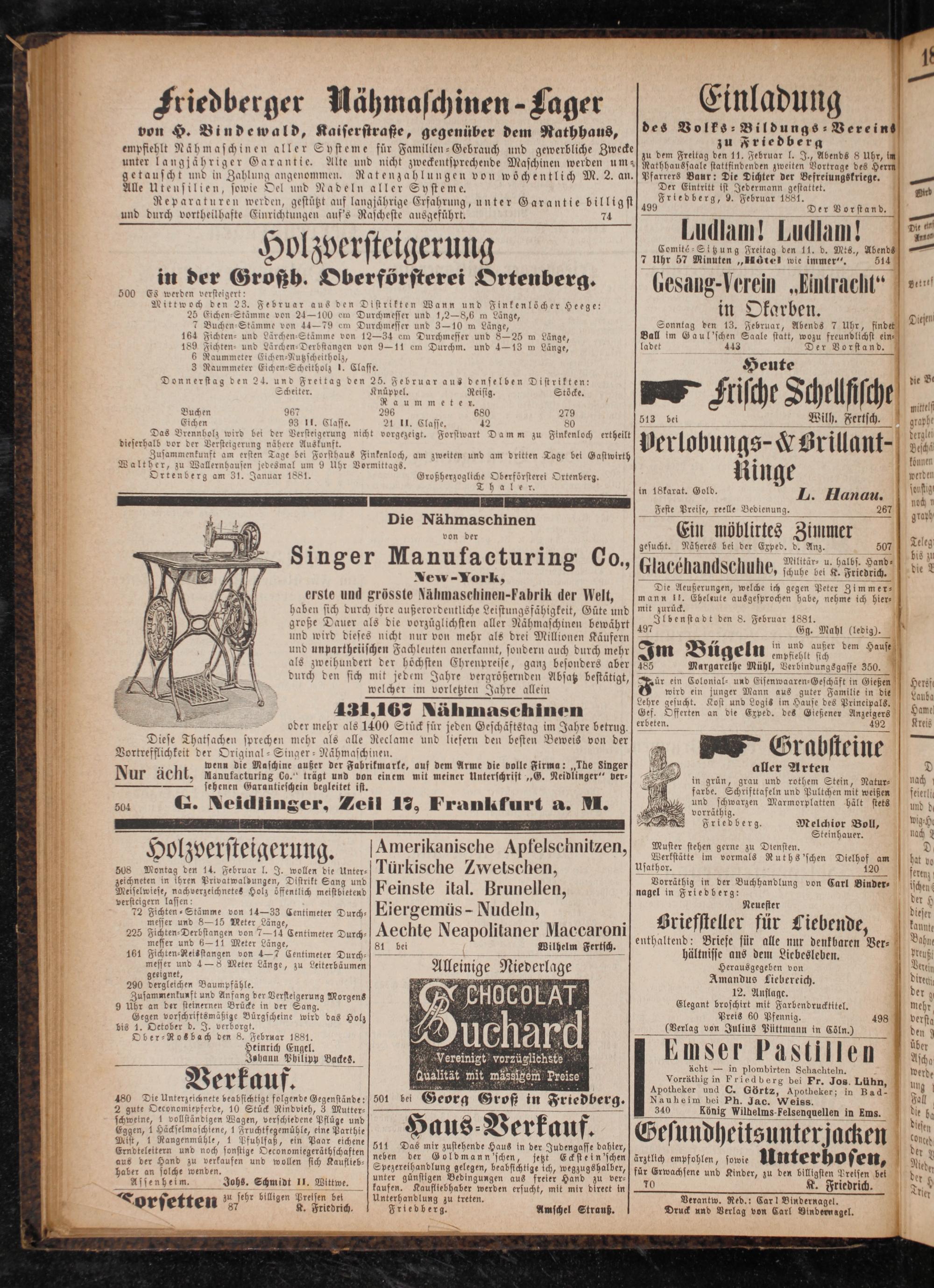 Der Eintritt ist Jedermann gestattet. Friedberg, 9. Februar 1881.