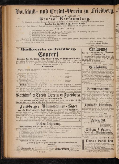 Der Eintritt ist Jedermann gestattet. 1 Friedberg, 7. März 1881. ö