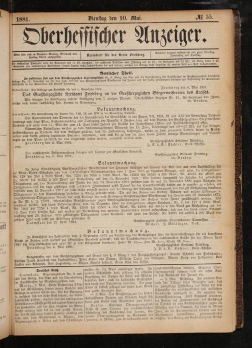 Wir bringen die Erledigung unserer Verfügung vom 7. vorigen Monats, Oberhessischer Anzeiger Nr. 3