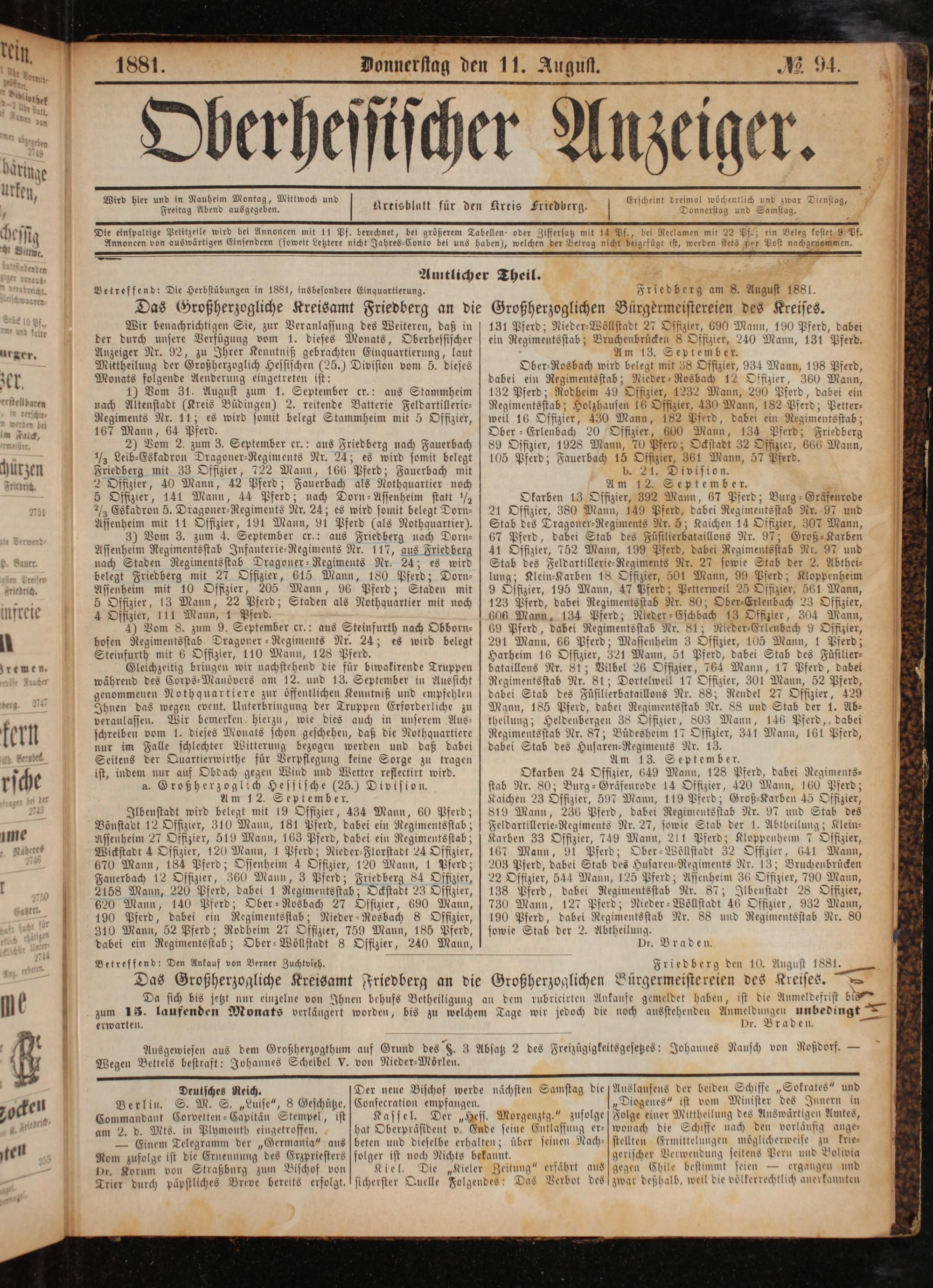 Wir benachrichtigen Sie, zur Veranlassung des Weiteren, daß in der durch unsere Verfügung vom 1. dieses Monats, Oberhessischer Anzeiger Nr. 92, zu Ihrer Kenntniß gebrachten Einquartierung, laut Mittheilung der Großherzoglich Hessischen(25.) Division vom 5. dieses Monats folgende Aenderung eingetreten ist: