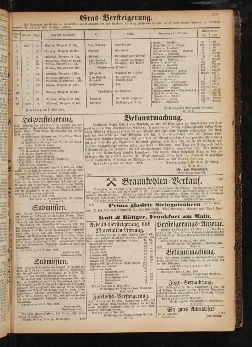 „ f Abthell l Nr. Monat. Tag. Tag und Tageszeit. Ort. Lokal. Benennung der Straßen. S von 13 1 Mai tag, 90 900 Gießen— Frankfurt 90 129 dal 16.] Montag, Morgens 11 Uhr, Bad ⸗Nauheim Deutscher Hof Nieder⸗Mörlen— Usingen 104 138,38 2 5 7. f M 5 1 2 Gießen— Frankfurt 76 90 * Dienstag, Morgens 10 Uhr, Butzbach Gambrinus Hessenbrückerhammer— Butzbach 72 116 3 8. it Morgens N un Berstadt— Friedberg 122 167,50 1 Mi gg, Lorgens 11 Uhr, Melbach Wirthschaft von Philippi Dechelmer Bergwerksstraße 0 5,6 4 1 19. Donnerstag, Morgens 10 Uhr, Ober⸗Rosbach Wirthschaft von Ruppel Friedberg— Homburg 137 168,80 5 1 20. Freitag, Morgens 10 Uhr, Ober⸗Wöllstadt Wirthschaft von Müller Gießen— Frankfurt 136 166 6 23. Montag 3 97 Gießen— Frankfurt 166 222,53 * eontag, Morgens 9½ Uhr, Selzerbrunnen Okarben Vilbel— Offenbach 219 220“7 7 9 i 8 Nieder⸗Wöllstadt— Hanau 161 206,8 7 5 24. een Morgens 10 Uhr, Ilbenstadt Gasthaus der 3 Hasen Ilbenstadt— Reichelsheim 167,8 190 8 25 Mittwoch, Morgens 10 Uhr, Ober⸗Eschbach Darmstädter Hof Bonames— Homburg 0 16,7 * 5K Mittwoch, Nachmittags 1 Uhr, Steinbach Gemeindehaus Höchst— Homburg 0 10,45 27 85. 5 5 2 5 Ilbenstadt— Reichelsheim 190 214 9 1 85 Freitag, Morgens 11 Uhr, Reichelsheim Post Bingenheim— Reichelsheim 146 151,8 Ilbenstadt— Büches 175,16 204 10 4 30. Montag, Morgens 10 Uhr, Chausseehaus bei Bönstadt[Schwalheimer Hof— Nonnenstumpf 162 183,52 1 Ranstadt— Staden 206 214,54 25 5 12 M 9 Ilbenstadt— Büches 204 258,16 5 31. Wie Morgens 11 Uhr, Altenstadt Wirthschaft Holzapfel Hersfeld— Hanau 328,29 385,70 12 Juni 2 Mittwoch, Morgens 10 Uhr, Büdingen Gasthaus zum Stern Gießen— Gelnhausen 225 283,75 Friedberg den 5. Mai 1881. Großherzogliches Kreisbauamt Friedberg. R eu ß. — 7 J 6. Bekannt Holzversteigerung. ekanntmachung. 1746 Montag den 16. Mai l. J. werden aus den Kaufmann Georg Hölzer von Butzbach, welcher als Unteragent zur Beförderung von Aus⸗