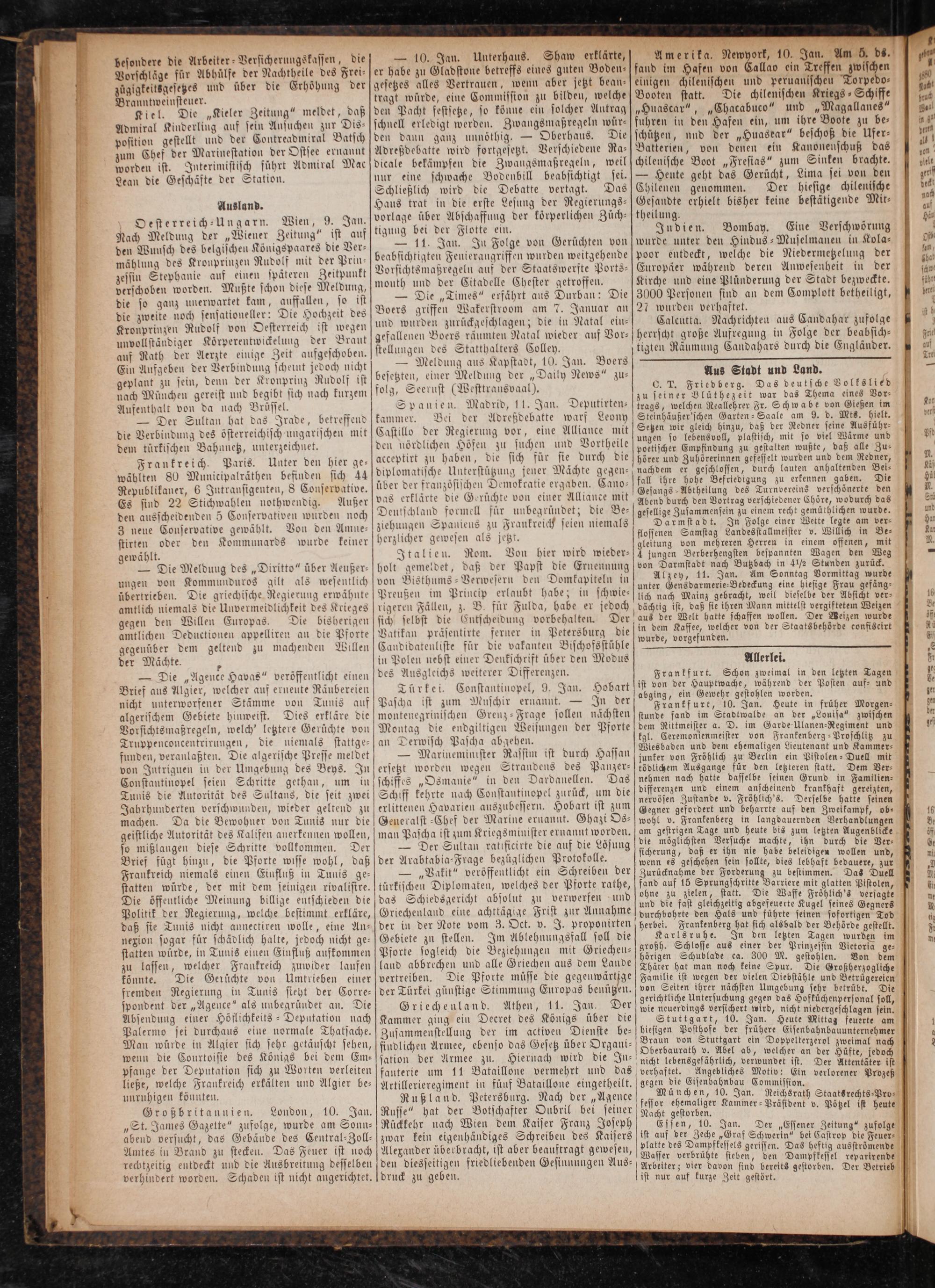 Ausland. Oesterreich-Ungarn. Wien, 9. Jan. Nach Meldung der„Wiener Zeitung“ ist auf den Wunsch des belgischen Königspaares die Ver— mählung des Kronprinzen Rudolf mit der Prin- zessin Stephanie auf einen späteren Zeitpunkt verschoben worden. Mußte schon diese Meldung, die so ganz unerwartet kam, auffallen, so ist die zweite noch sensationeller: Die Hochzeit des Kronprinzen Rudolf von Oesterreich ist wegen unvollständiger Körperentwickelung der Braut auf Rath der Aerzte einige Zeit aufgeschoben. Ein Aufgeben der Verbindung scheint jedoch nicht geplant zu sein, denn der Kronprinz Rudolf ist nach München gereist und begibt sich nach kurzem Aufenthalt von da nach Brüssel.