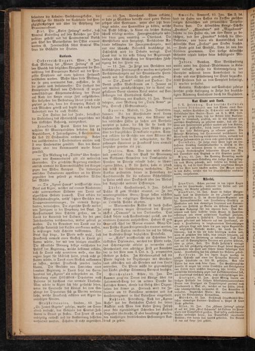 Indien. Bombay. Eine Verschwörung wurde unter den Hindus-Muselmanen in Kola— poor entdeckt, welche die Niedermetzelung der Europäer während deren Anwesenheit in der Kirche und eine Plünderung der Stadt bezweckte. 3000 Personen sind an dem Complott betheiligt, 27 wurden verhaftet.