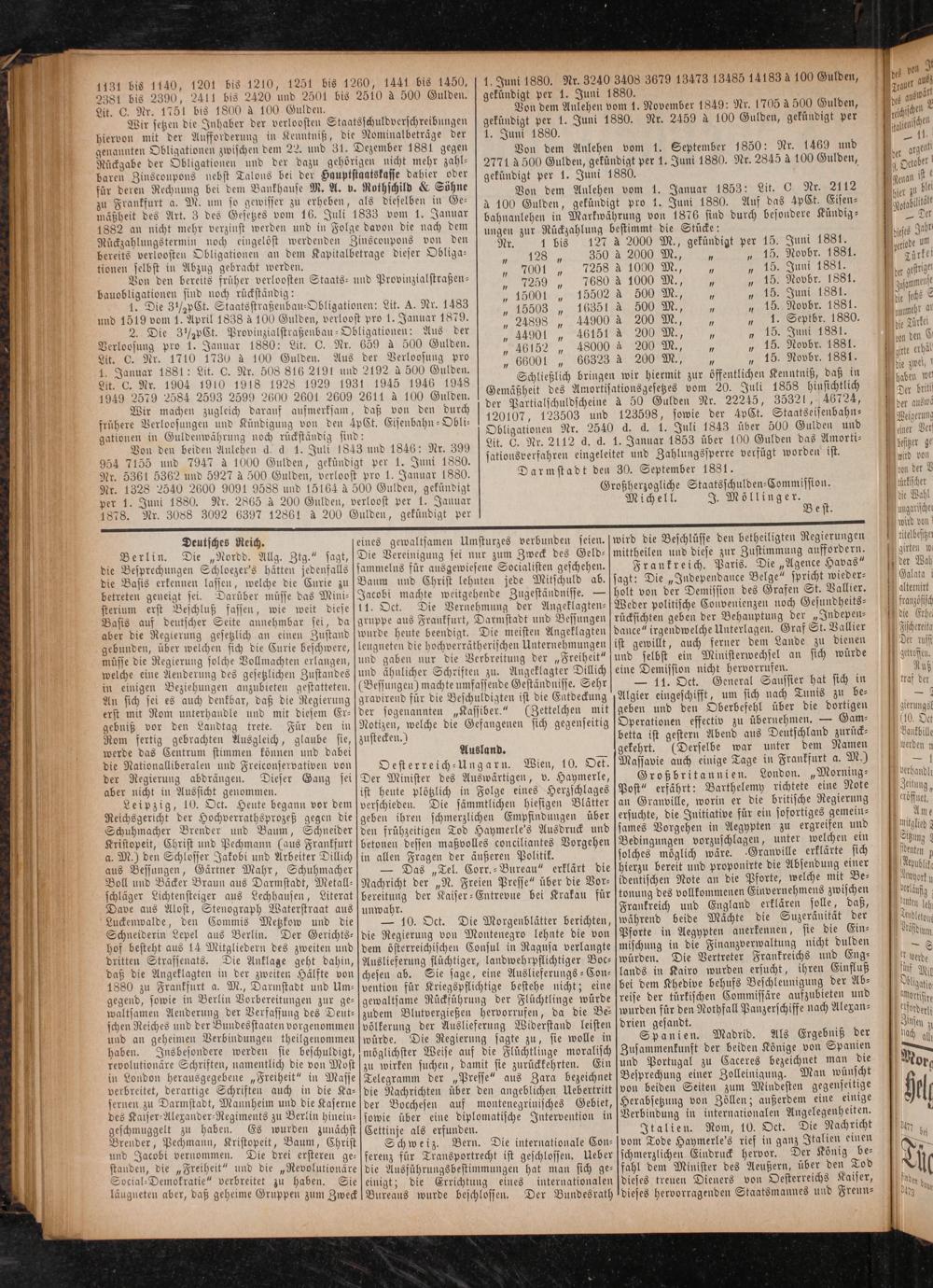Von dem Anlehen vom 1. September 1850: Nr. 1469 und 2771 à 500 Gulden, gekündigt per 1. Juni 1880. Nr. 2845 à 100 Gulden, gekündigt per 1. Juni 1880.