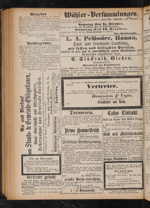 3479 Henriette, verehelichte Wiltheiß, geb. Hübner, Elisabetha Hübner und Katharina Hübner von Ober— Florstadt, sämmtlich unbekannt wo? abwesend, eventuell deren Leibeserben, haben spätestens im Termin Mittwoch, 30. November l. J., Vormittags 9 Uhr, ihre Rechte an den geringen Nachlaß ihrer zu Venedig verstorbenen Schwester Marie Hübner bet unterzeichneter Gerichtsstelle anzumelden, als sonst der Nachlaß den Antragstellern Georg und Heinrich Carl Hübner von Florstadt über⸗ wiesen werde. Friedberg am 6. Oetober 1881. Großherzogliches Amtsgericht Friedberg. Herzberger. Hohenstein, Hülfs-Gerichtsschreiber.