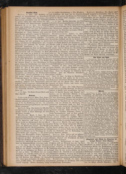 Berlin, 9. Juni. Der Reichstag ge— nehmigte die Innungsnovelle zur Gewerbeord— nung in dritter Lesung, unter Ablehnung aller Amendements unverändert nach den Beschlüssen der zweiten Lesung und nahm sodann eine auf die Errichtung einer Gewerbekammer bezügliche Resolution an.— 10. Juni. Der Reichstag lehnte nach dreistündiger Berathung in nament— licher Abstimmung mit 153 gegen 102 Stimmen den für den Volkswirthschaftsrath geforderten Etatsposten ab. Dafür stimmten beide conser— vative Parteien geschlossen, dagegen die National— liberalen, die Seeessionisten, die Fortschritts— partei und die Polen ebenfalls geschlossen. Das Centrum stimmte getheilt. Der Reichstag setzte seine Sitzung fort und genehmigte in zweiter Lesung unverändert den Gesetzentwurf, betr. die Abänderung des Zolltarifs für bedruckte und unbedruckte Zeugwaaren.— 11. Juni. Der Reichstag genehmigte den Rest des Unfallgesetzes nach fast siebenstündiger Sitzung in zweiter Lesung fast unverändert nach den Anträgen der Com⸗ mission und nahm nur zu Artikel 47 den Zusatz an, welcher die Haftbarkeit für die Aufwendungen der Versicherungsanstalten bei vorsätzlichen oder durch grobes Verschulden verursachten Unfällen auch auf die Innungen ausdehnt. Der Reichs— tag beendete sodann in einer Abendsitzung die zweite Lesung des Unfallgesetzes und nahm den Schluß unverändert nach den Anträgen der Com— mission an. Den F. 56b nahm er nach der Fassung von Cuny an, wonach die aus den Be— stimmungen dieses Gesetzes entstehenden Rechts— streitigkeiten zur Competenz des Reichsgerichts gehören sollen. Darauf genehmigte er in erster und zweiter Lesung die Handelsverträge mit Oesterreich-Ungarn, der Schweiz und Belgien.