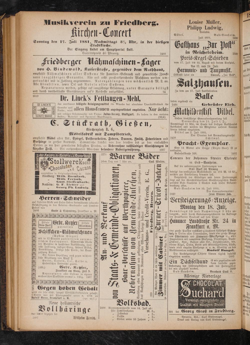 Bad-Nauheim den 10. Juli 1881. Der Coneursverwalter: 2493 Jaean Wörner jun.