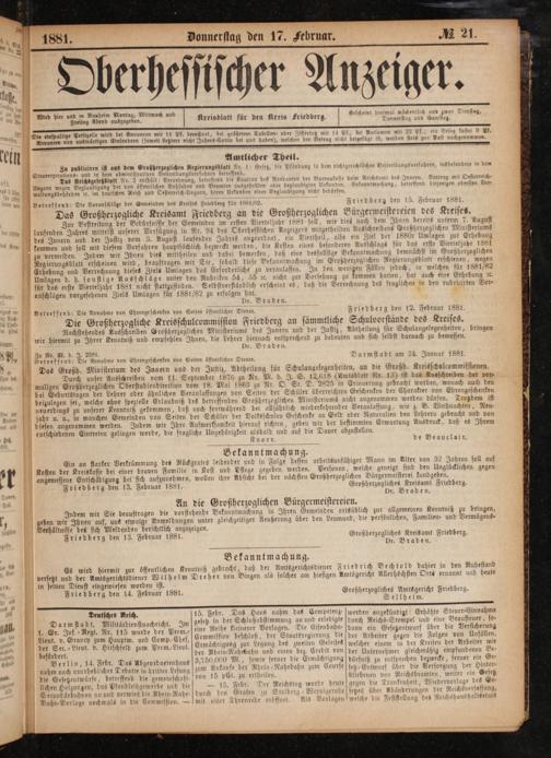 Das Großherzogliche Kreisamt Friedberg an die Großherzogl Bedürfnisse der Gemeinden im ersten Vierteljahr 1881 soll, Oberhessischen Anzeigers mitgetheilten Ausschreibens Großherzoglichen Ministeriums ein Viertheil, also ein Ziel der 1880 r Umlagen zur Erhebung