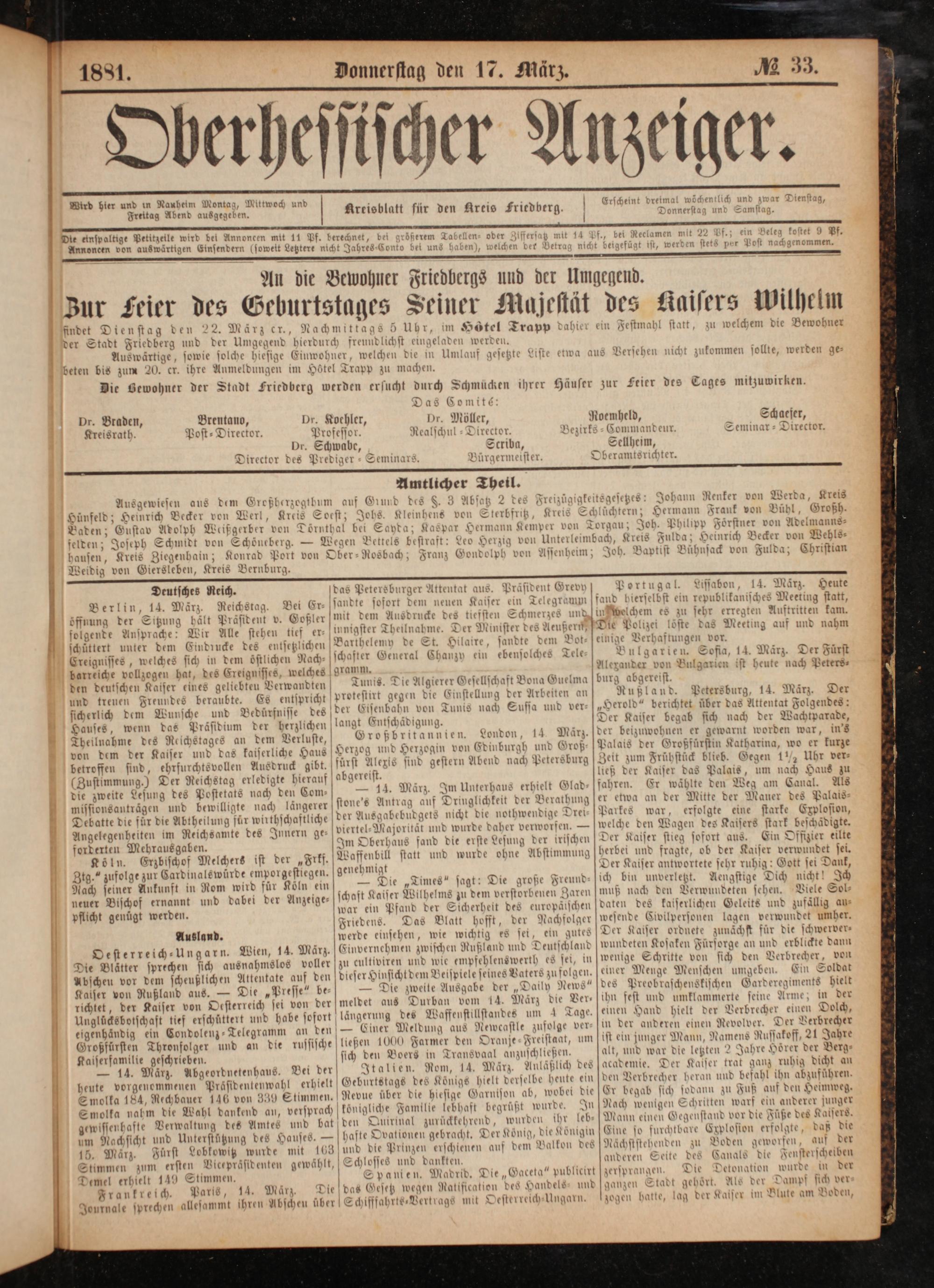 Rußland. Petersburg, 14. März. Der Herold“ berichtet über das Attentat Folgendes: Der Kaiser begab sich nach der Wachtparade, der beizuwohnen er gewarnt worden war, in's Palais der Großfürstin Katharina, wo er kurze Zeit zum Frühstück blieb. Gegen 1½ Uhr ver⸗ ließ der Kaiser das Palais, um nach Haus zu fahren. Er wählte den Weg am Canal. Als er etwa an der Mitte der Mauer des Palais⸗ Parkes war, erfolgte eine starke Explosion, welche den Wagen des Kaisers stark beschadigte. Der Kaiser stieg sofort aus. Ein Offizier eilte herbei und fragte, ob der Kaiser verwundet sei. Der Kaiser antwortete sehr ruhig: Gott sei Dank, ich bin unverletzt. Aengstige Dich nicht! Ich muß nach den Verwundeten sehen. Viele Sol— daten des kaiserlichen Geleits und zufallig au⸗ wesende Civilpersonen lagen verwundet umher. Der Kaiser ordnete zunächst für die schwerver— wundeten Kosaken Fürsorge an und erblickte dann wenige Schritte von sich den Verbrecher, von einer Menge Menschen umgeben. Ein Soldat des Preobraschenskischen Garderegiments hielt ihn fest und umklammerte seine Arme; in der einen Hand hielt der Verbrecher einen Dolch, in der anderen einen Revolver. Der Verbrecher ist ein junger Mann, Namens Russakoff, 21 Jahre alt, und war die letzten 2 Jahre Hoͤrer der Berg⸗ academie. Der Kalser trat ganz ruhig dicht an den Verbrecher heran und befahl ihn abzuführen. Er begab sich sodann zu Fuß auf den Heimweg. Nach wenigen Schritten warf ein anderer junger Mann einen Gegenstand vor die Füße des Kaisers. Eine so furchtbare Explosion erfolgte, daß die Nächststehenden zu Boden geworfen, auf der anderen des Canals die Fensterscheiben zersprangen. Die Detonation wurde un der ganzen Stadt gehort. Als der Dampf sich ver